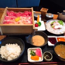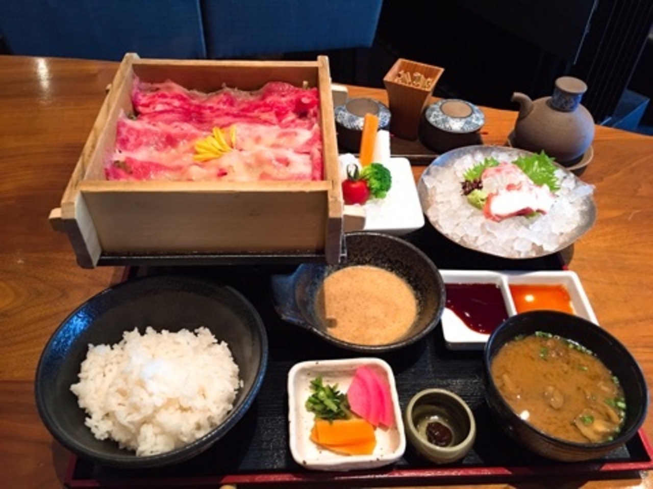 卓上には灰皿がセットされているので、ランチタイムも喫煙可能なようです。近江牛御膳をオーダーしました。脂が多いのがザンネン。