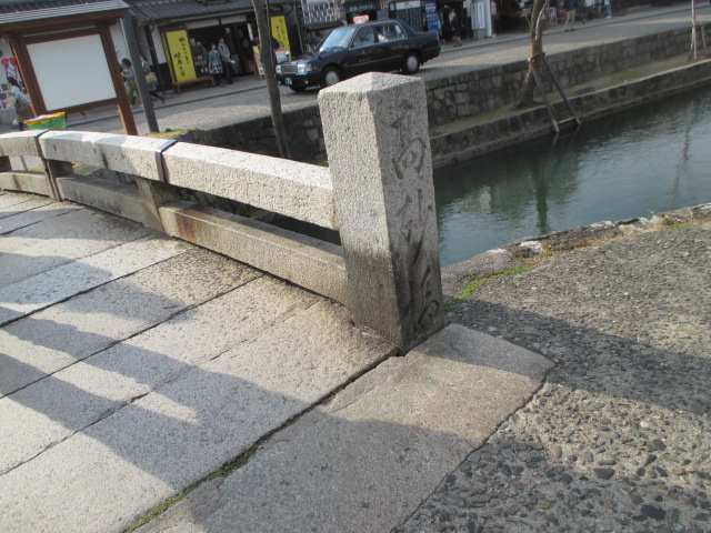 宿泊先のアイビースクエアーから美観地区に入ると、まず倉敷川とこの高砂橋に出会います。石造りの重厚な橋で、橋の欄干の端に書いてある「高砂橋」の字体がとても素晴らしいです。この字体がこの橋の重厚感を演出しているという感じです。