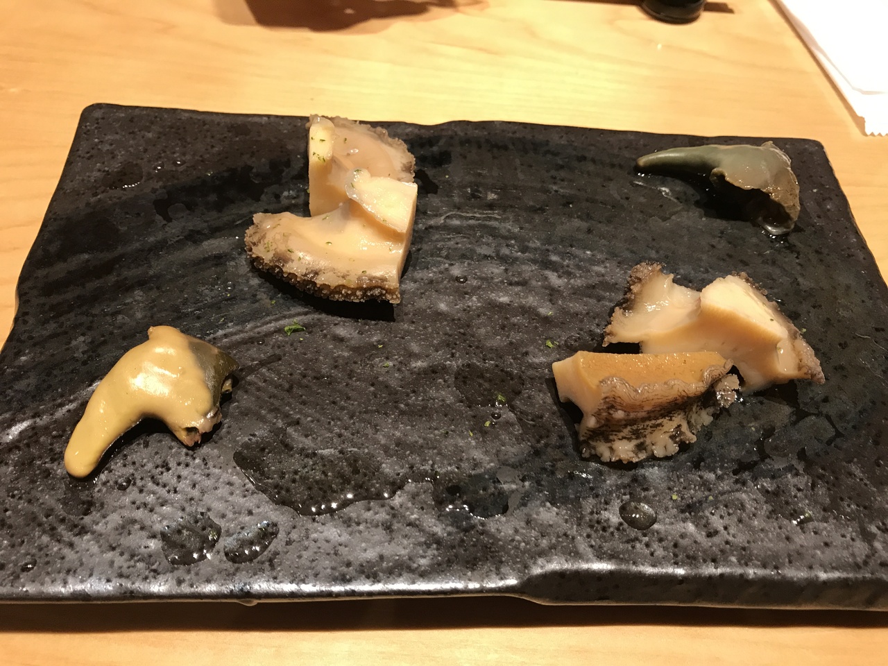 お任せ握りコースのみですが、少しずつ出て来て、鮑の煮物やしじみの味噌汁など握り以外のものもあります。握りも一つ一つに異なる味付けで、丁寧な仕事を感じます。本当にオススメ出来る店だと思います。