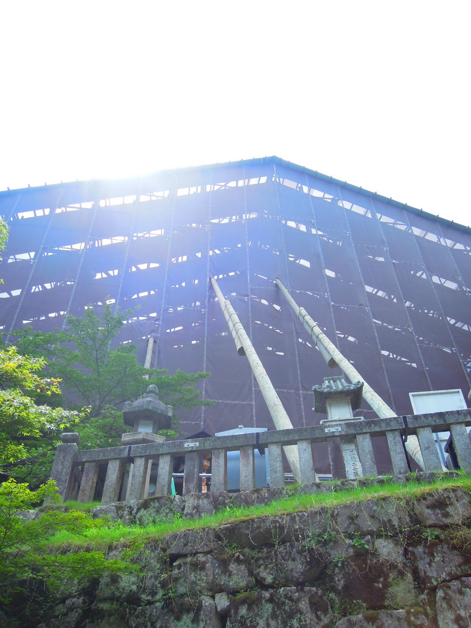 清水寺といえば京都の代表的な観光地です。改修工事をしているので本堂には大きな幕が張られていました。有名な清水の舞台は、幕に覆われていましたが、舞台そのものには行く事ができました。そこから正面の山を見て楽しみ、本堂外に出た後にくだる石段を下りながら見上げるとまたスケールの大きさを感じることができました。