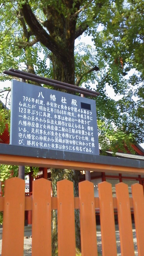 東寺の敷地内にある朱塗りが目を引く神社です。寺の敷地に鳥居?と思いますが、由来が書いてある案内板を見ると、この寺を守ってくれる神様として祀られたそうです。神様がお寺を守るなんて、ずいぶんおおらかな気がしますが、長くこの地で信仰されてきたのかと思うとそれもありだなと思いました。