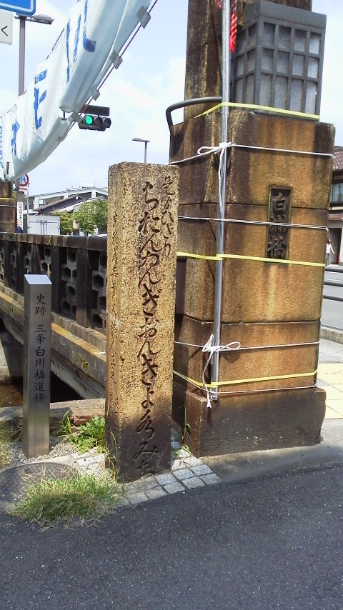 三条通りを歩いている途中に小さな橋があり、それがこの三条白川橋でした。なんてことなく通り過ぎてしまいそうでしたが、ふと見ると古びた石の道しるべがあり、昔はここは大切な道の交点だったんだなーと感慨深くなりました。