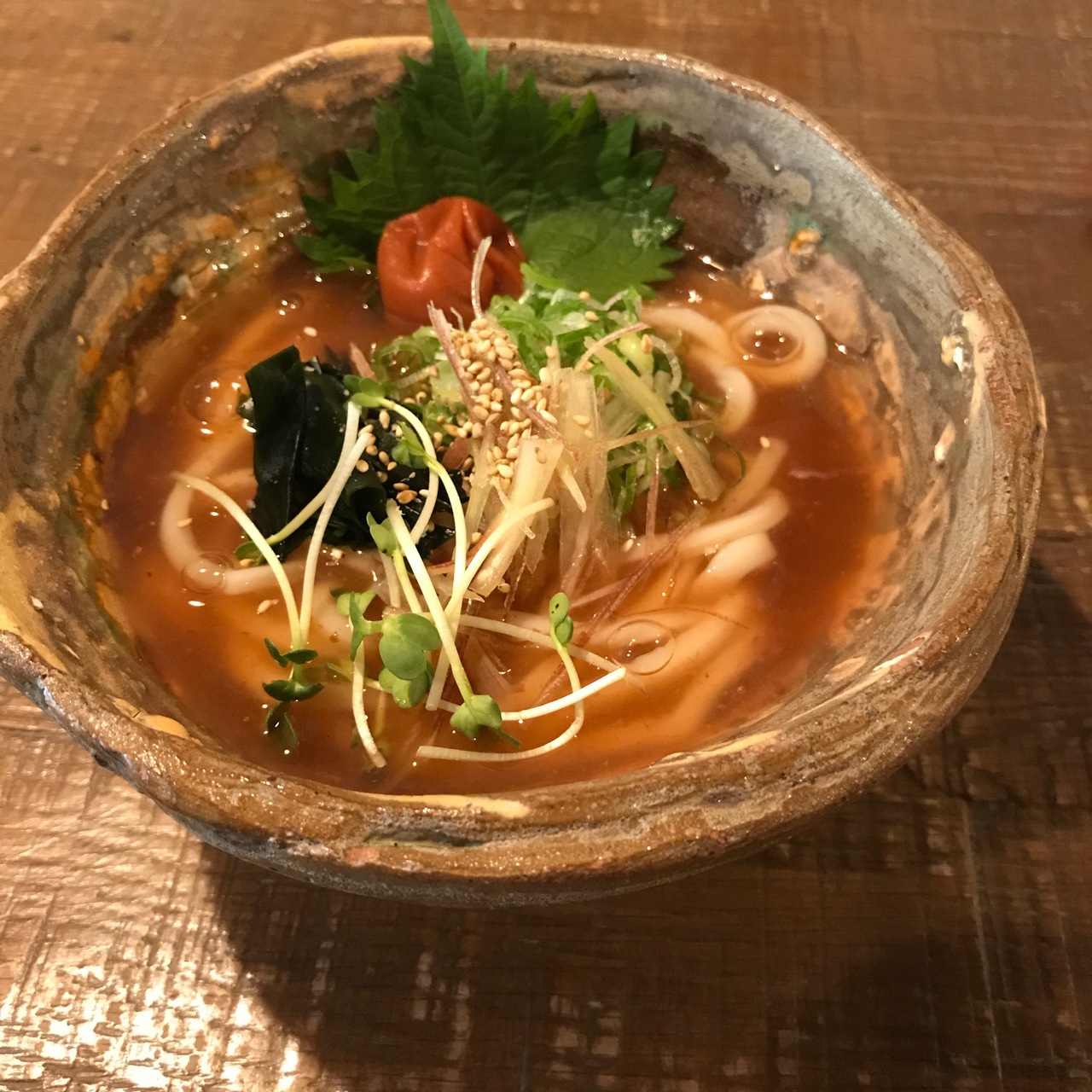 新町の厚生年金、今のオリックス劇場前にステキうどん屋さんがあると聞いてランチへ。めっちゃおしゃれ。しかもうどんは創作系がメインでどれもそそる感じ。冷やしあんかけうどんをチョイスしました。めちゃウマ。梅とみょうがでさっぱり。