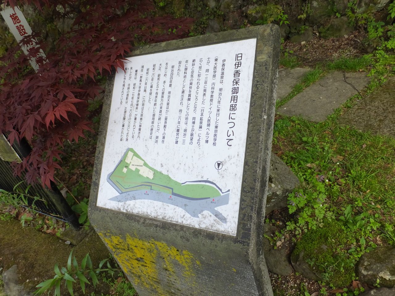 戦争の終わりまでここに御用邸(皇室の保養施設)があったそうです。ただ、残っているのは石が2つだけで、あずまやを建ててその下に展示されているだけです。あとは当時の建物の見取り図と写真がプリントされた標が建っているだけです。道路から石段を上がって訪問するだけの価値はないと思います。