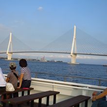 この橋もベイブリッジ同様、斜張橋(しゃちょうきょう)で、後からできたこともあって国内3位。また全長(1020m)は一面吊りの斜張橋としては世界一の長さです。