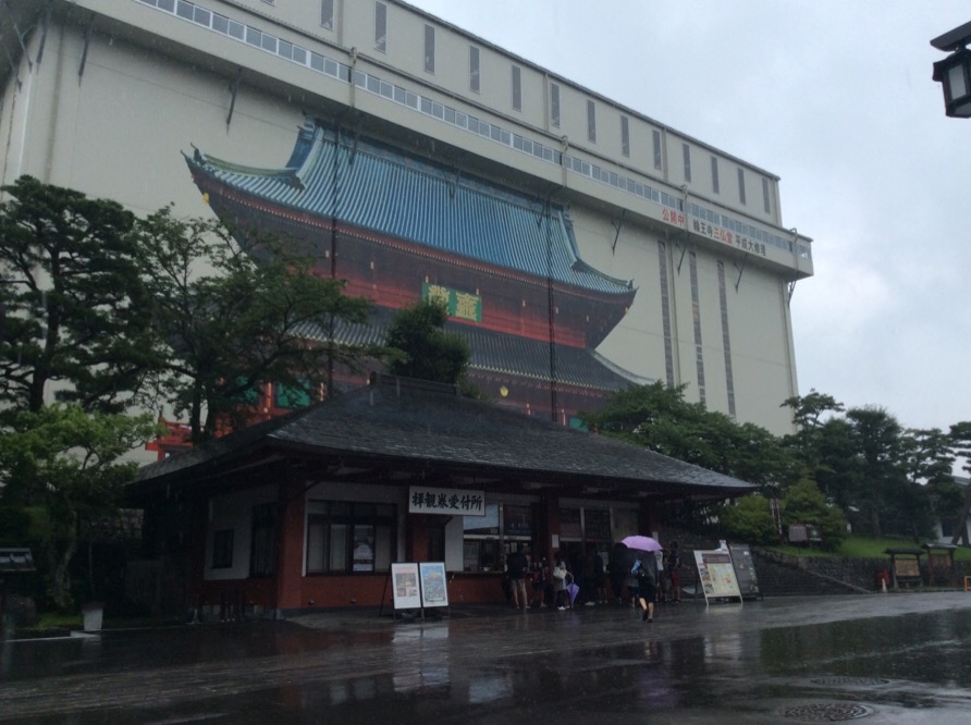2017年の8月に訪れた際には修復の途中で、大きな保護幕がかけられていました。そのカバーに実物大でしょうか三仏堂の写真がプリントされていましたので、その大きさと色彩は想像できました。内部には多くの密教関連の展示がされていました。