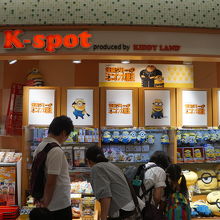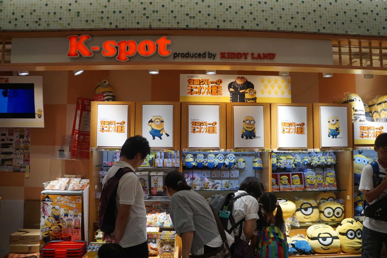 Kスポットは、キャラクターストリートの店舗ではなく、通り沿いの売り場といった感じ。公開中の映画「怪盗グルーのミニオン大脱走」に合わせた商品が前面に出ていました。水泳で使う水中眼鏡をかけた一つ目のキャラクターとか。本来は化け物なんでしょうが、何とも愛らしい感じ。テーマパークの中にいるような感覚になってしまうお店です。
