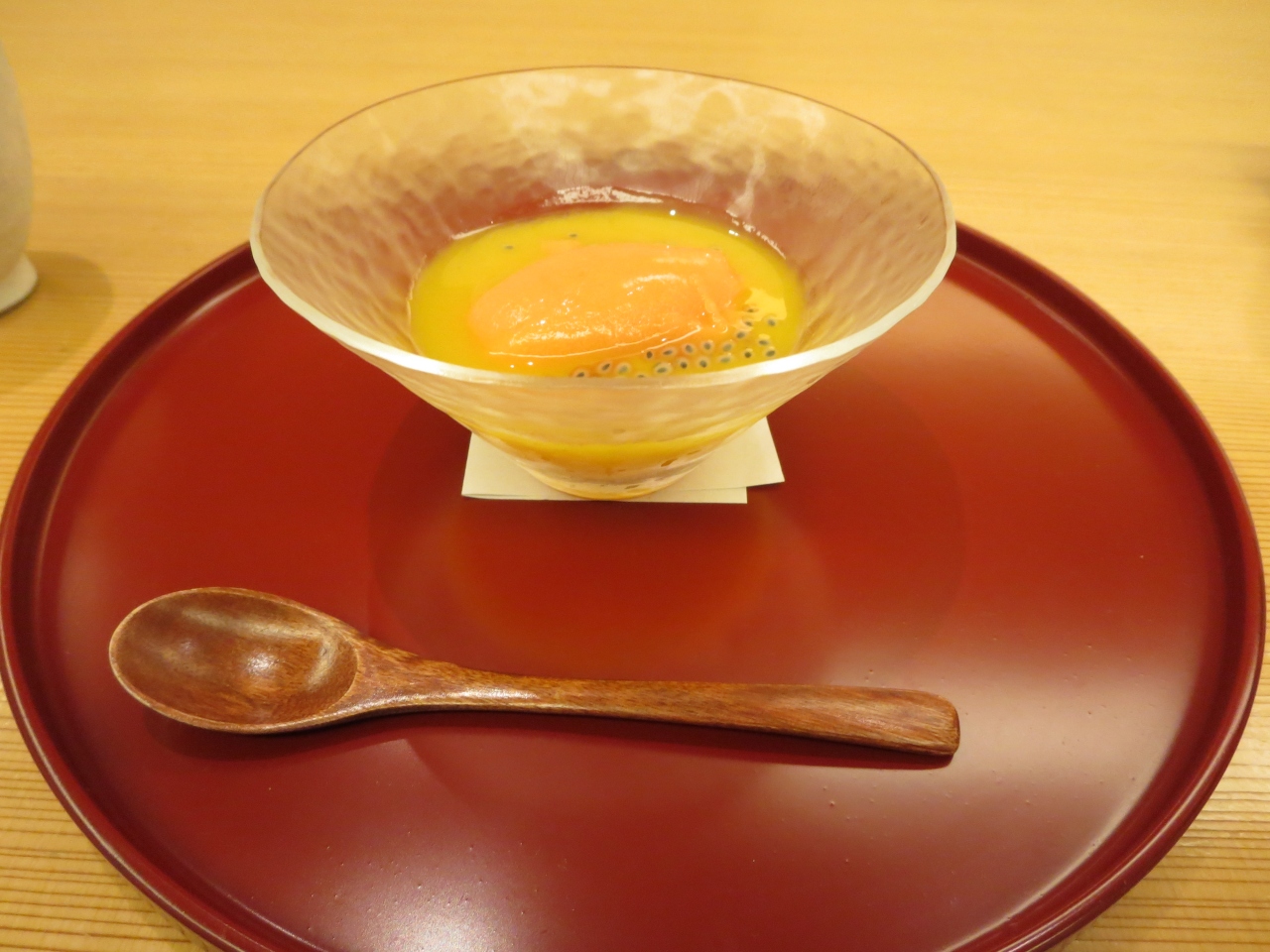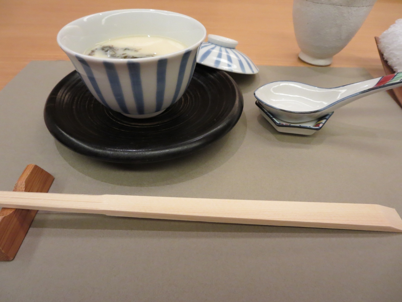 最初に茶碗蒸しが来ました。「熱いですよ」と言われましたが、器も中身もとてもアツアツで、猫舌のためやけどしそうになりました。