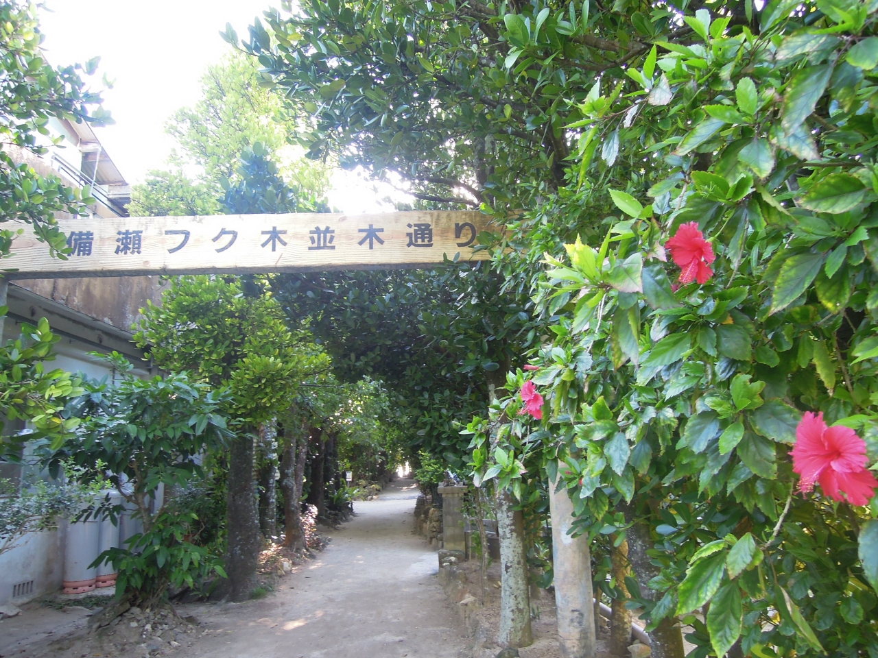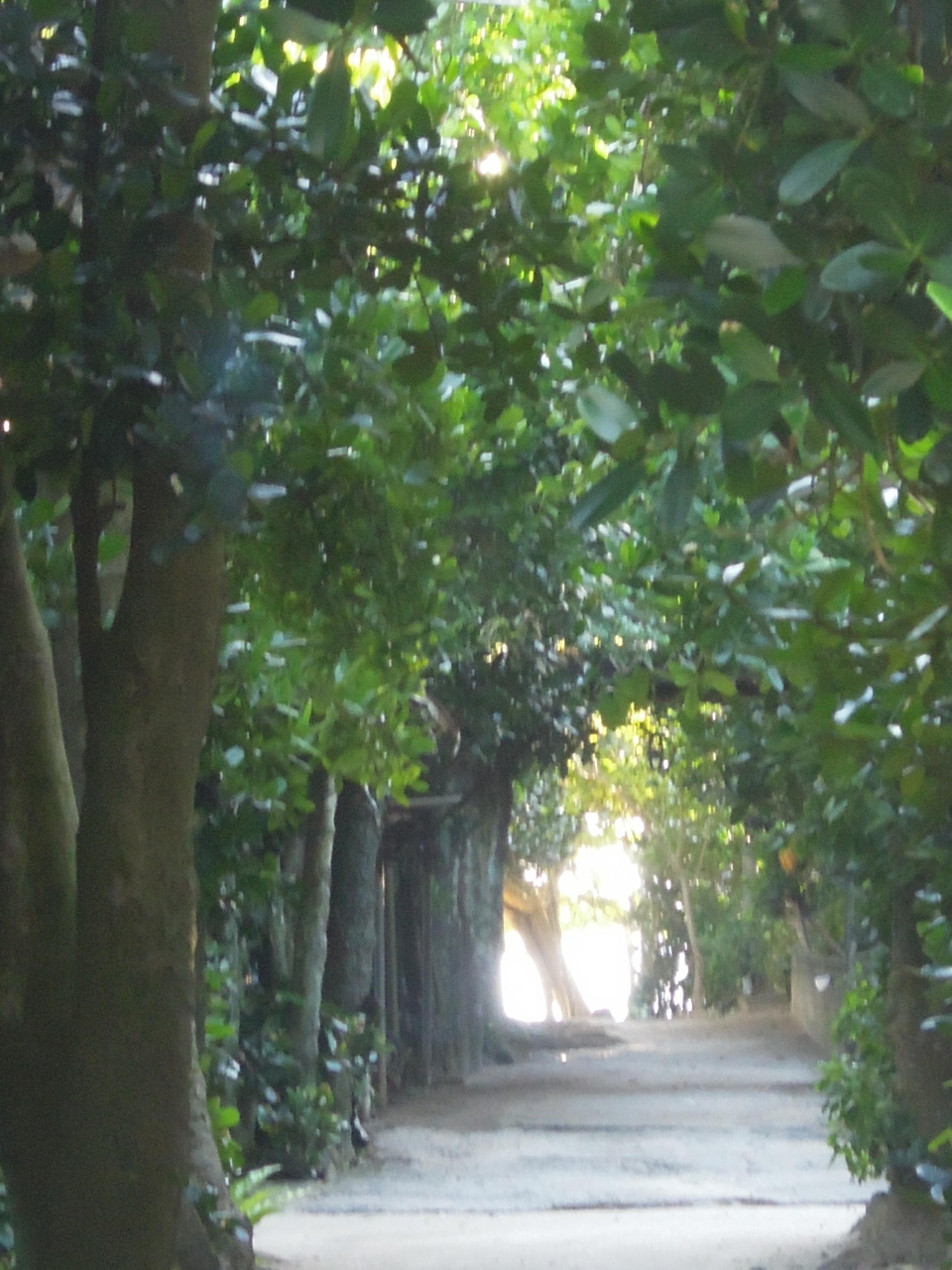 美ら海水族館から近いです。台風から建物を守るために植えられたというフクギの木々。真夏の太陽に照り付けられ、木々の隙間から差し込む光が幻想的です。こんな緑の道を歩きながら点在するカフェをめぐるのもいいかもしれませんね!