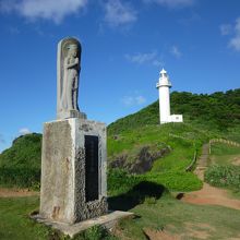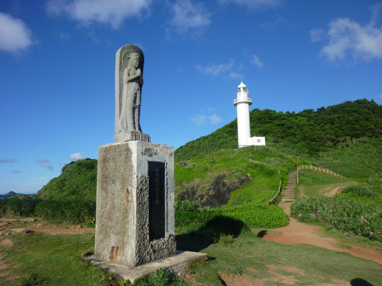 県道をから薄暗い細い坂道を走ると、急に視界が開けて灯台が見えます。小さな駐車場とトイレがあります。目の前に灯台があって急な階段で登れます。断崖の上に立つ灯台からの眺めは最高です。おすすめは灯台を降りて海の方へ行って仏像のあるところです。振り返って見ると白い灯台、緑の山、青い空どれもクリアーな色で感動しました。そのとき撮った写真を見てもきれいです。午後4時ごろでしたが太陽の向きがよかったのでしょうか。ここは西向きの岬なので夕陽がきれいな場所としてしられています。左手の崖の上を伝って行くと本当の先端まで行くことができます。