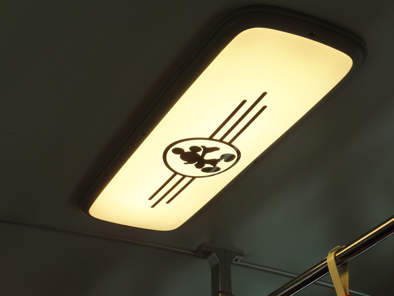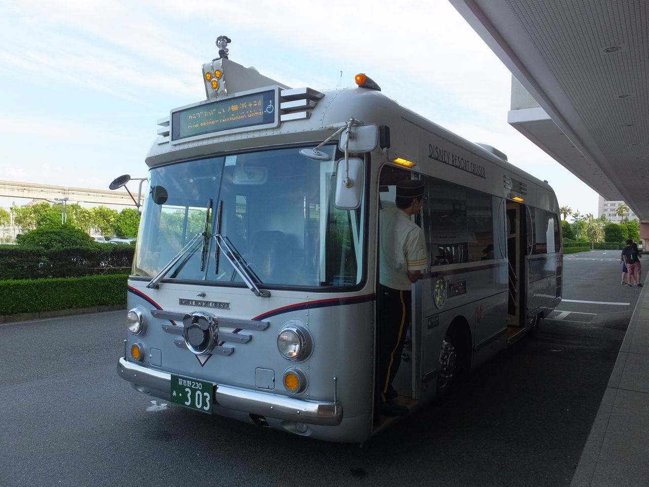 ホテルと舞浜駅、ホテルとディズニーランド/ディズニーシーを結ぶバスで、クラシカルなアメリカンなスタイルでステンレス様の車体です。そしていたるところにミッキーのフラクタル模様が。車内は赤い簡易なビニールシートでまったく豪華ではないですが、短距離用なので十分でしょう。