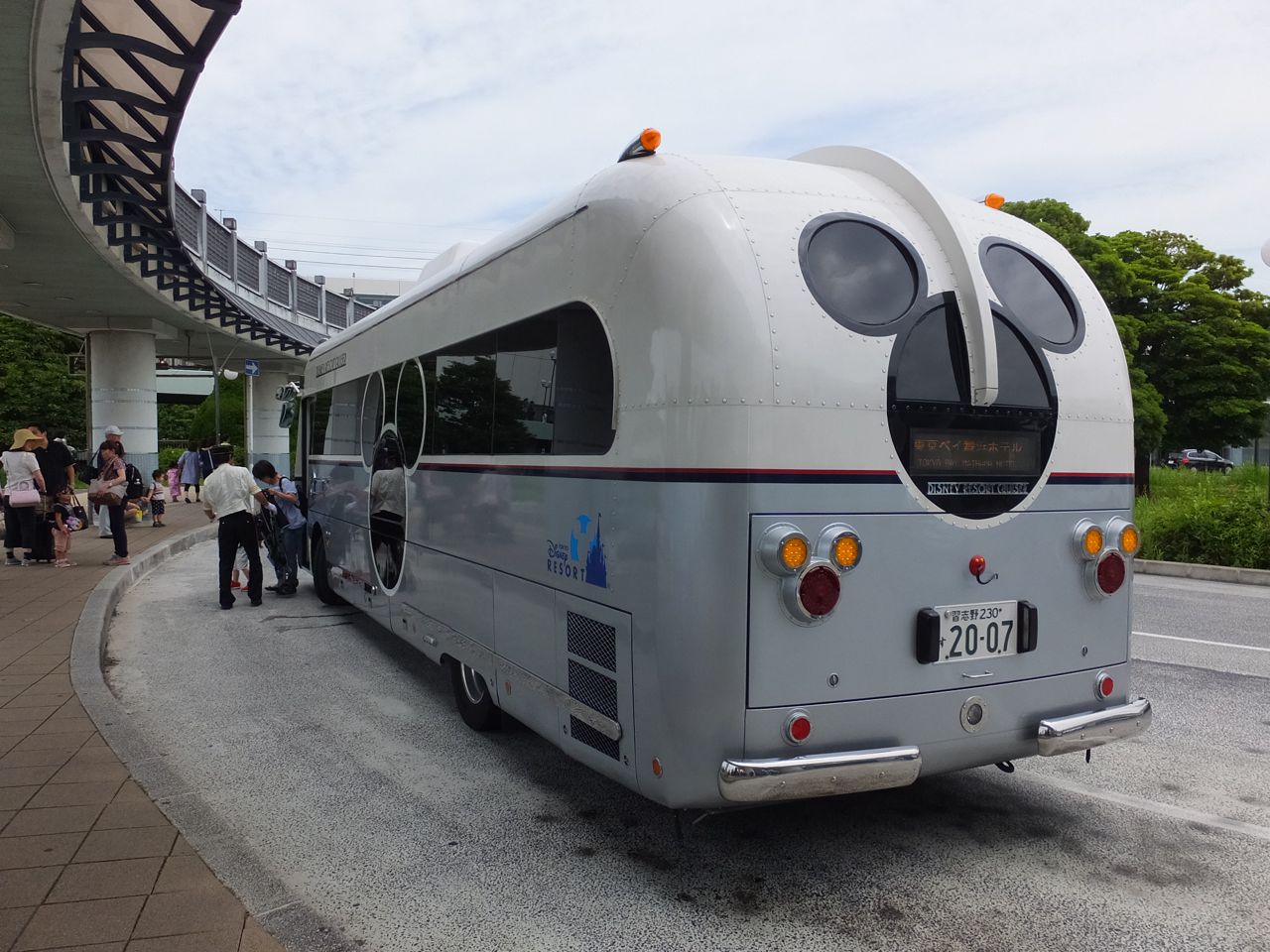 実は2種類あって、ナンバープレートが緑色のと白色のがあります。見ていると前者はランド/シー行き、後者は舞浜駅行きのようです。そしてホテルによっては駅行きには普通のホテルの送迎バスを充てているようでした。「ミッキーじゃない!」と鳴き騒いでいる子がいたりしてちょっとかわいそうになったこともあります。