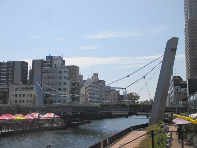 道頓堀川に架かる橋で、一番目立つ吊り橋です。少し道頓堀の雰囲気からは、浮いてる感も否めないのですが、フォルムが美しいつり橋です。大阪市もこの橋の美化には力を注いでいるみたいで、橋の上に鉢植えが飾られていました。通っている人も多く、道頓堀の新名所って感じでした。