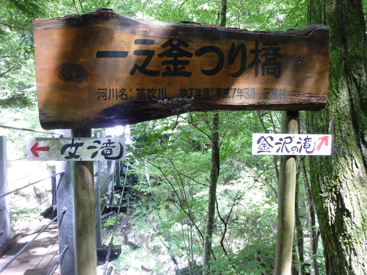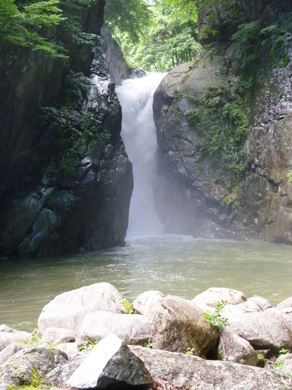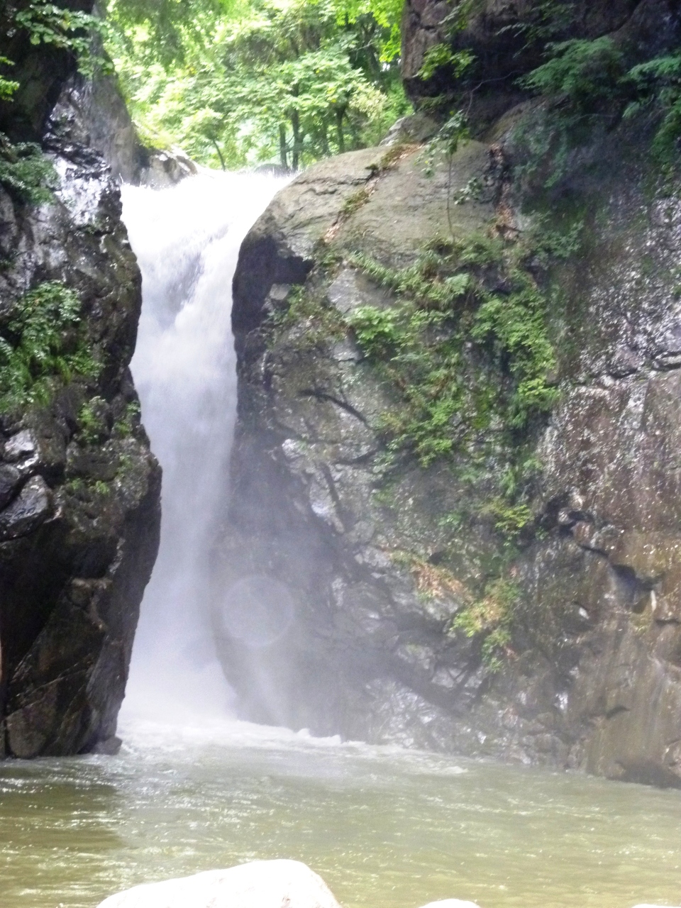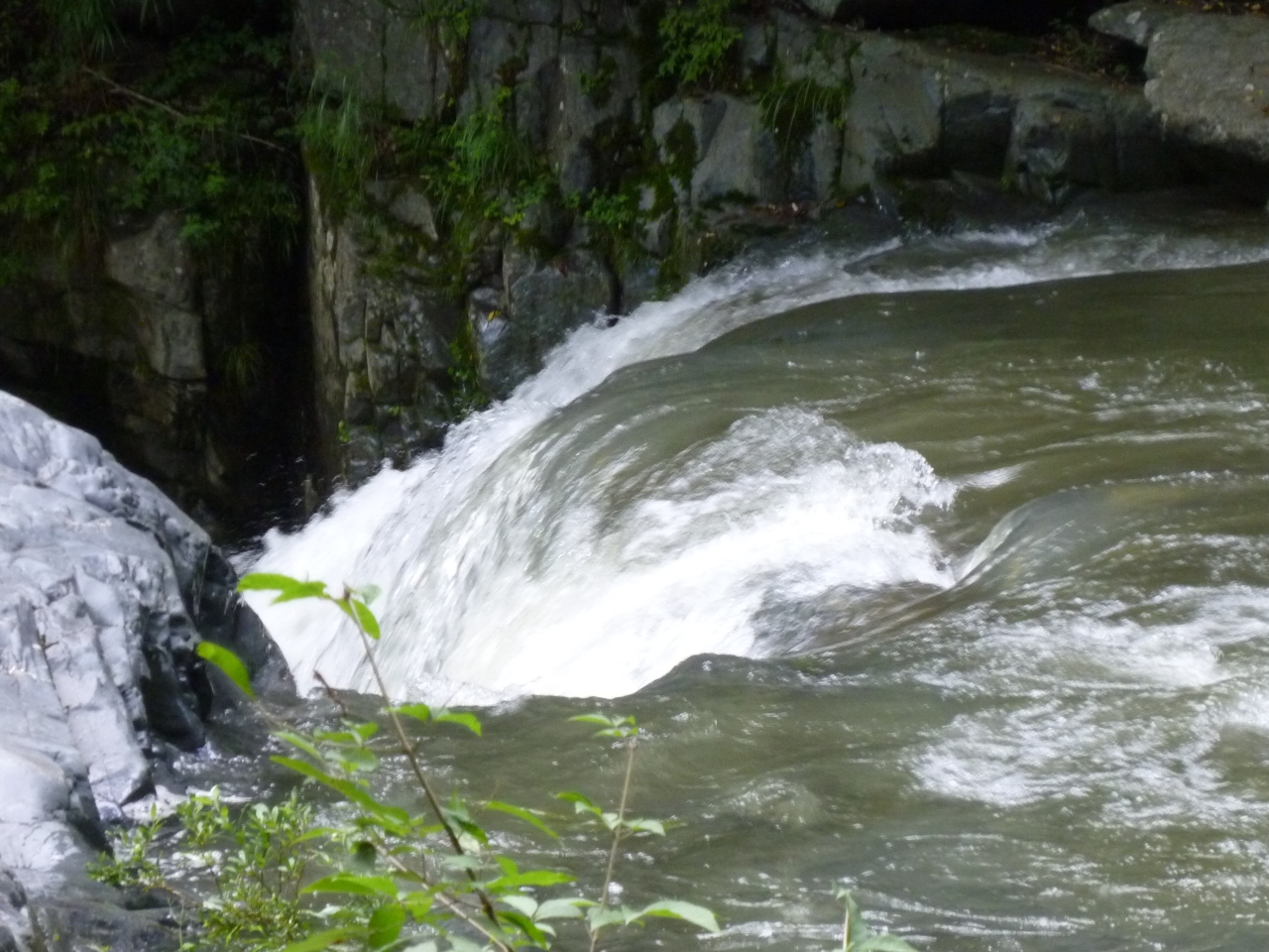 国内旅行の観光スポットとして、近年観光会社が発掘した場所だそうです。吊橋までの階段が降り難く、観光バスで行くと人数が多いので、途中はすれ違うのもちょっと大変な狭さです。大雨の後なので水量が多く水煙が流れてきて、全身も写真機もしっとりしました。 滝のそばの足元は岩場でスペースも広くありません。