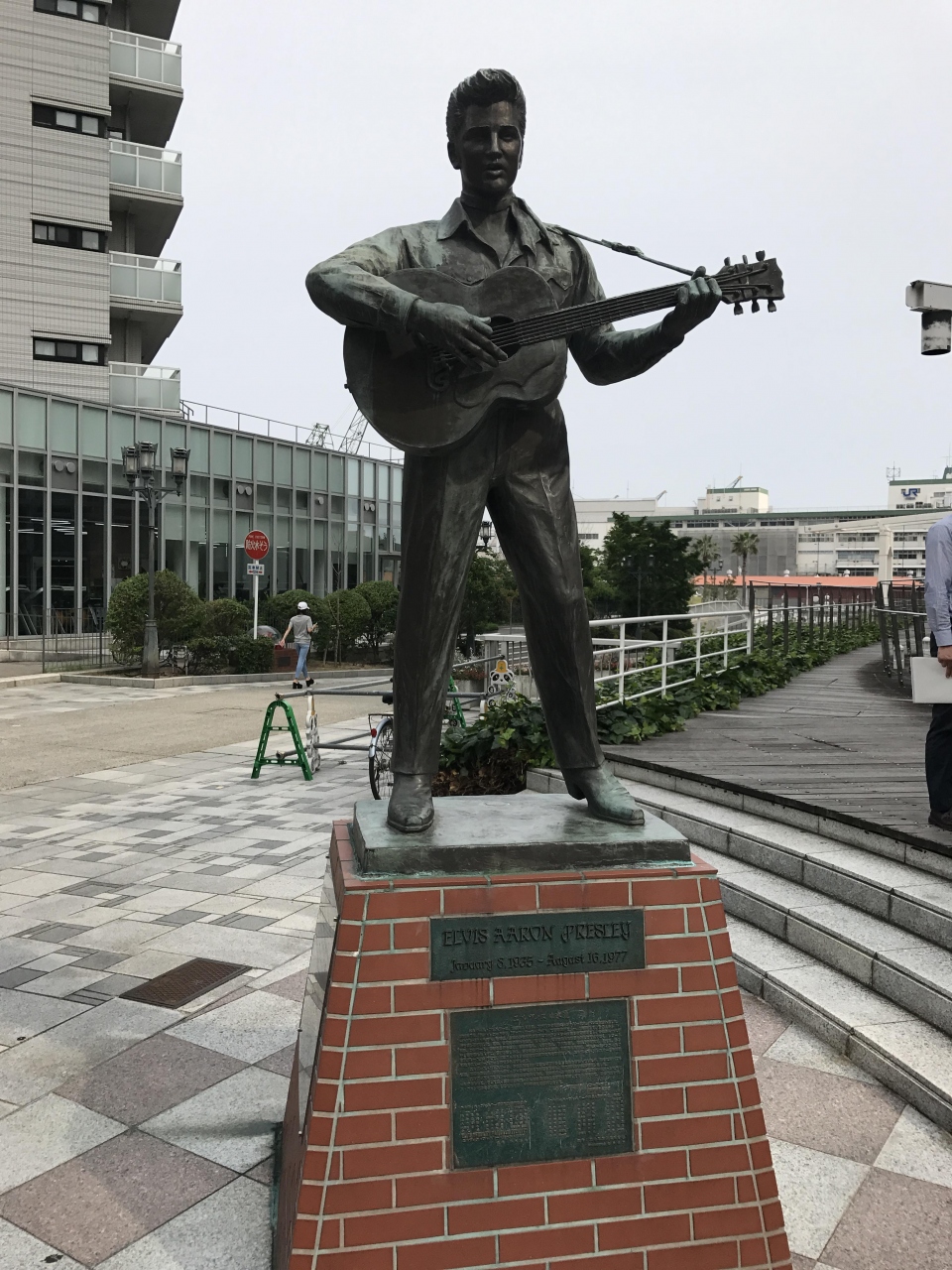 神戸のハーバーランド、ガス燈通り沿いにある銅像です。歩いているときに突然エルヴィスの銅像が現れたのでびっくりしました。それなりに大きく迫力があって、かっこよかったです。なぜここにあるのかは謎でしたが、ファンにはたまらない銅像だと思いました。