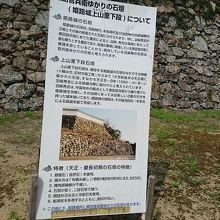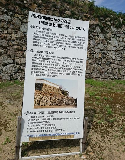 姫路城の西の丸を見学し終え帰る途中「黒田官兵衛ゆかりの石垣」の案内板が目に留まりました。「天守の庭」(礎石)の奥にありました。大小様々な形も揃わない石が積み上げられていました。野面積みという自然の石を積みあげて築いた石垣です。秀吉時代の石垣、時代を感じさせます。