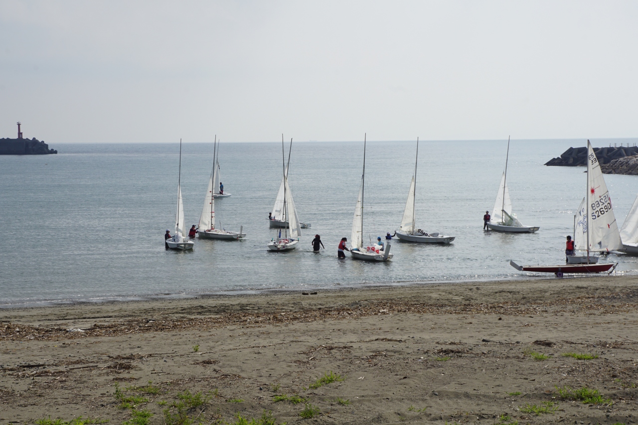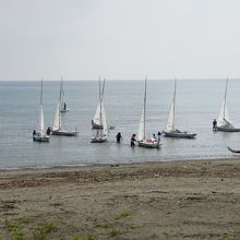 手結住吉海岸は、国道から入ると広いコンクリートの駐車場やトイレもあって、設備が整っている感じ。海岸の方に出てみると防波堤に囲まれた静かな入江でセーリングをしている人がたくさん。ヨットの愛好家の聖地的な場所になっているようです。