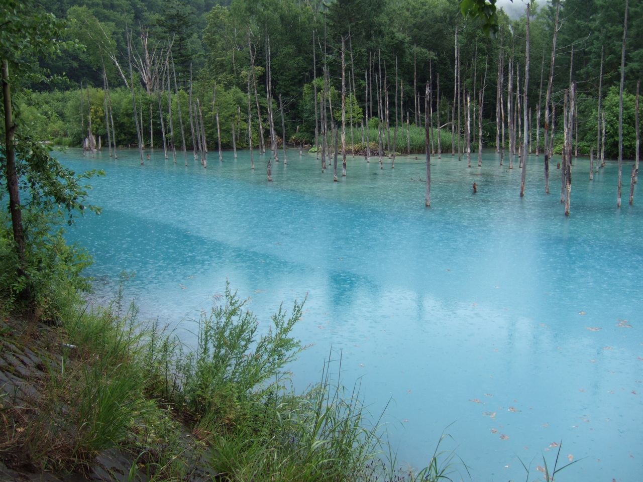美瑛でも、かなり白金温泉に近い場所にあります。雨の平日11時近くでしたが、駐車場は8割方埋まっていました。駐車場から歩いてすぐの階段を下りると池のほとりの遊歩道に出ますが、ちゃんわちょんわ賑やかな方達が狭い道の真ん中で自撮り棒で撮影していて、とても歩きづらい。駐車場待ちで5キロ近く渋滞することもあるそうです。