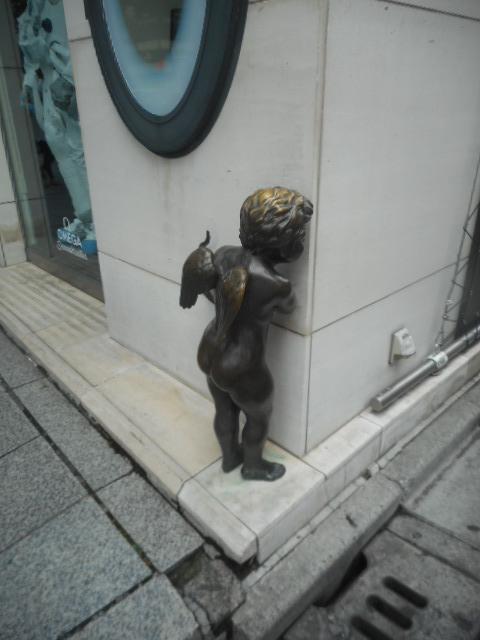 銀座、晴海通りに面した老舗の”天賞堂”のビルの角に、覗くようにして建っているのがキュピット像で、目線を下にして歩き、気を付けていないと見落とします。大勢の通行人が普段に歩く道で、冬はサンタクロースになるのですが、今頃は衣装無しでした。