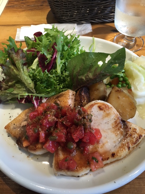 お肉とお魚で迷い、お魚料理をオーダー。たっぷりに野菜にカジキが調理されたものがワンプレートで出されました。味は少し薄いかなという感想です。