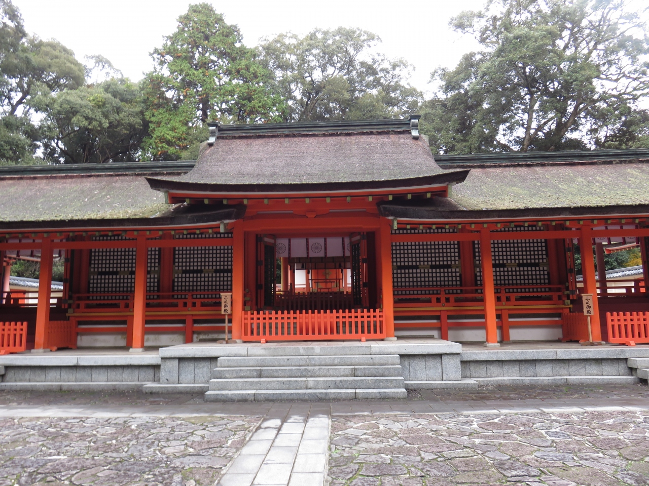 本殿が亀山の上に鎮­座しているので上宮と呼ぶのに対して、その麓にあるのでその名がついたようです。伊勢­神宮の内宮・外宮を思い出しました。社殿は切妻造で、祭典ごとに本宮の御供を調理されていた場所で「御炊殿」とも呼ばれていたそうです。朱に塗られた社殿が印象的でした。