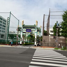 横浜中華街にはいくつか中華門がありますが、JR京浜東北根岸線の石川町駅方面から中華街に行くときに通るであろう門です。門の側は学校で、まだ中華街らしい風景ではありませんが、もうすぐ中華街という雰囲気は出てきます。