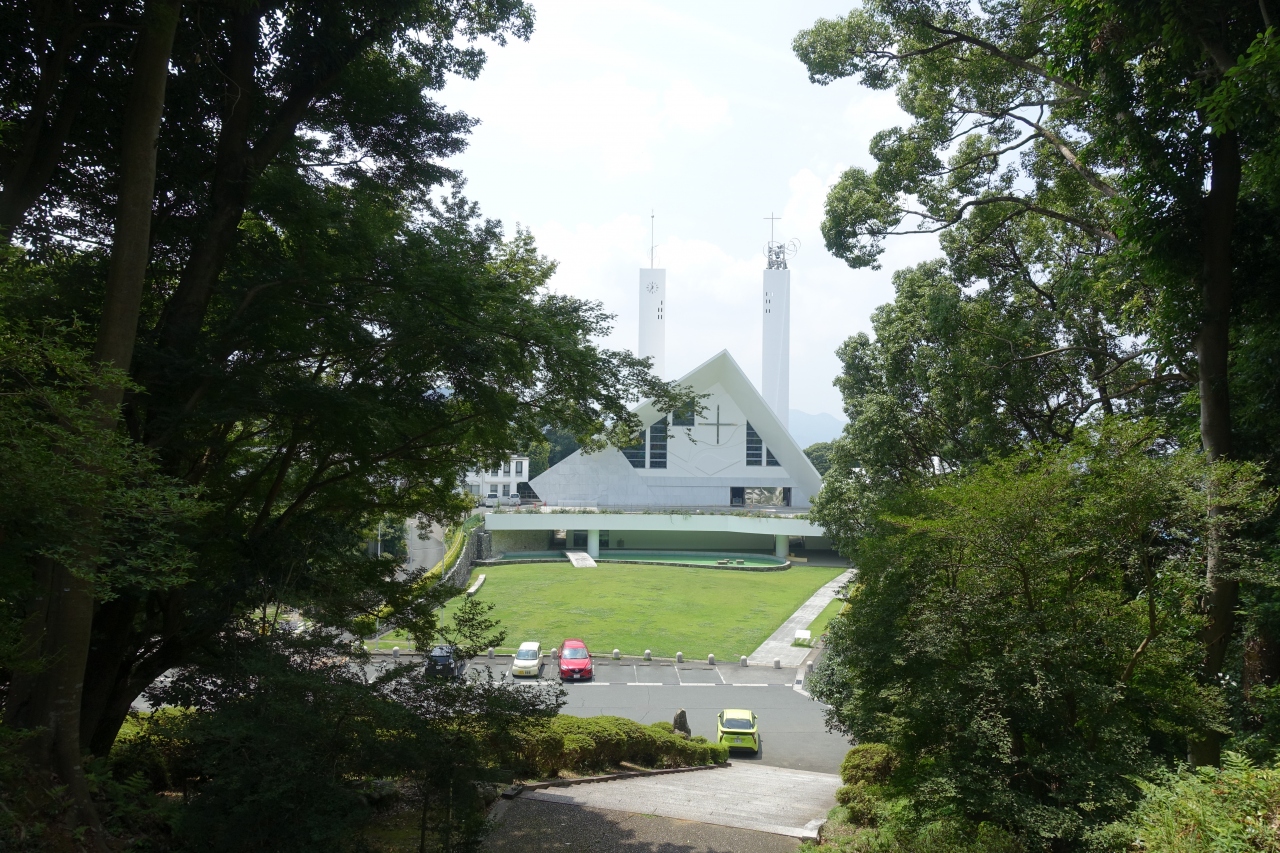 教会(記念聖堂)の特徴的な形をした塔は、遠くからでもよく見え、ついつい近くで見てみようという気になり、記念聖堂の前まで行きました。亀山公園の一画にあるのですが、山口駅側からは公園の反対側にぐるっと回りこまないと行くことができず、たいへんでした。地図で最短距離をよく確認して行った方が賢明です。聖堂の前にはザビエルの碑もありました。