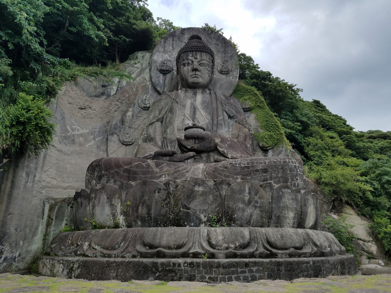日本寺は約1300年前に開山された、鋸山を境内とする大自然のなかスケールの大きいお寺です。麓から山頂まではロープウェーか有料道路で移動することになりますが、見所は標高差があるためお子さんやお年寄りと一緒の方には車利用をお勧めします。山頂付近には「地獄のぞき」と呼ばれる展望台や、崖岩を刻んで作られた「百尺観音」、そして少し下ったところには、日本一の大きさを誇る大仏が鎮座しています。現在の大仏は50年前程に復元されたもので、鎌倉大仏の2倍以上の大きさがあります。