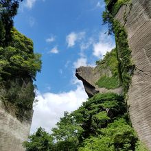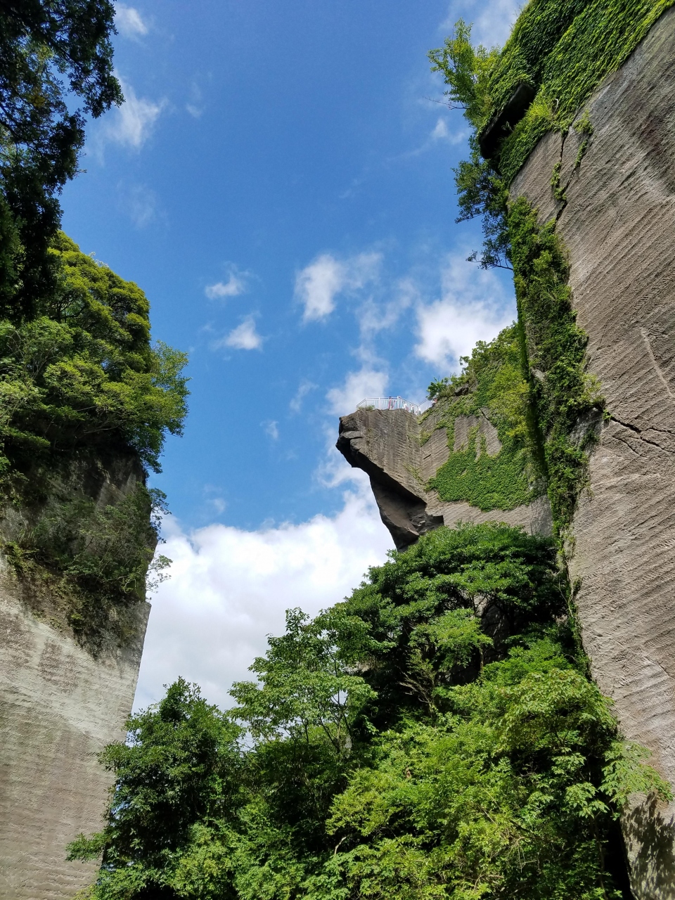 鋸山山頂には「地獄のぞき」と呼ばれる展望スポットがあります。突き出した岩から景色を眺めるのですが、狭いので順番で待たされた割には、それほど怖くありませんでした。あとで岩の下にある百済観音から見あげると、本当にそこだけが岩が突き出ていて怖さを感じました。