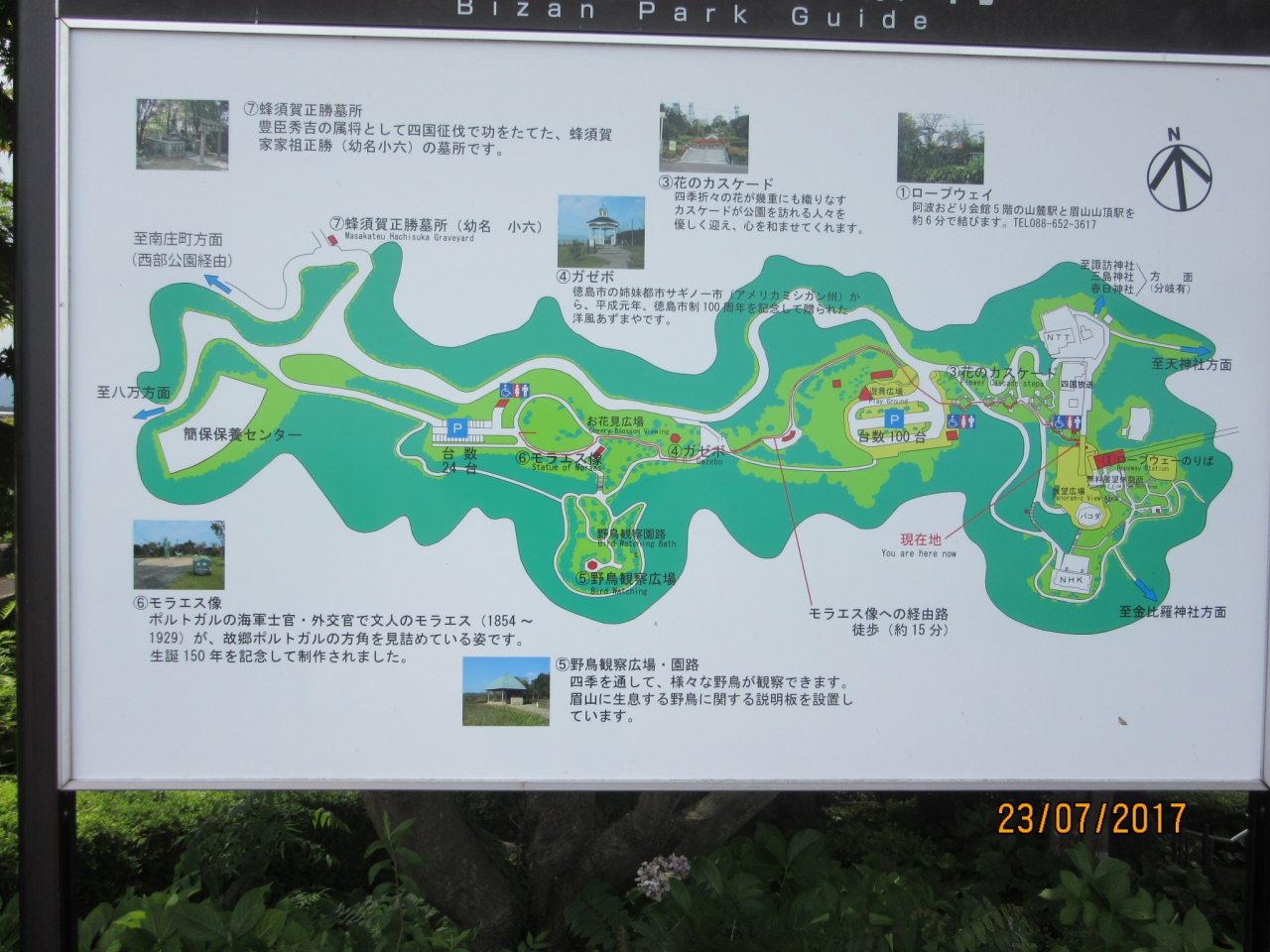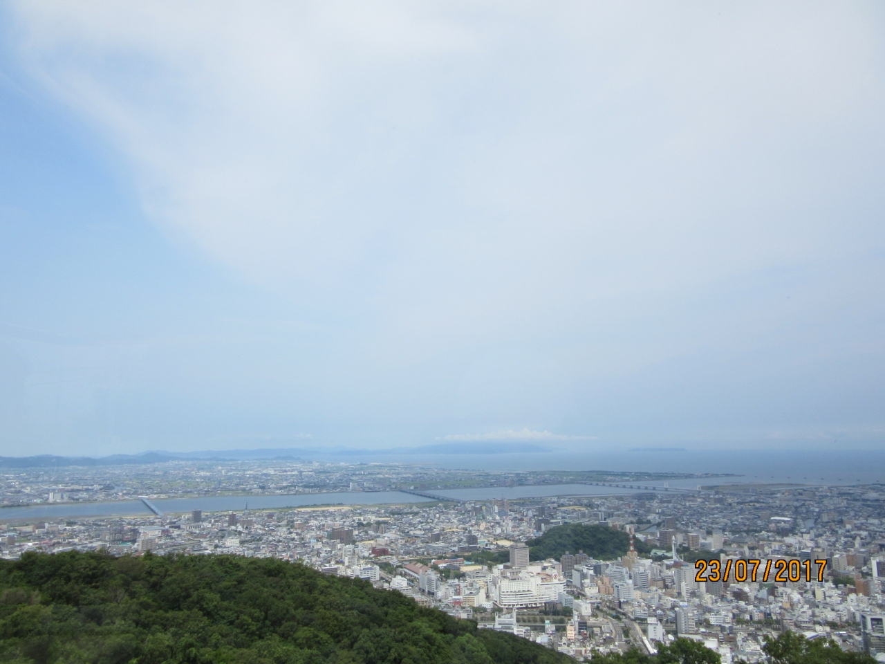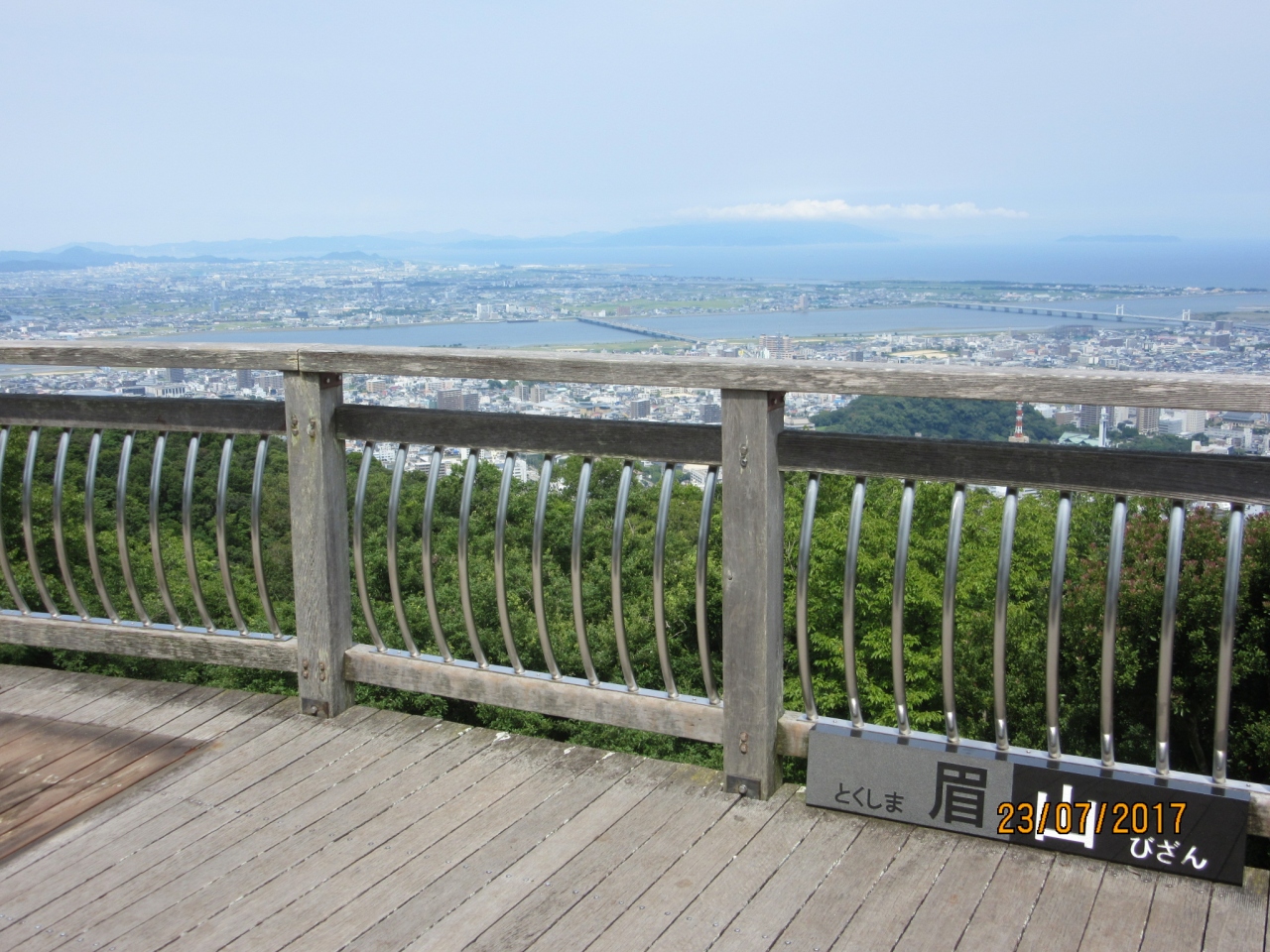 徳島駅から徒歩10分程度で【阿波おどり会館】に着くが、その5階からロープウェイで行くことができる。どの方向から見ても【眉の姿】に見える高さ290メートルの徳島のシンボル。2007年さだまさし原作、松嶋菜々子主演の映画【眉山】の舞台となったことで有名。山頂には展望台があり、吉野川、徳島市街・淡路島の絶景が一望であった。