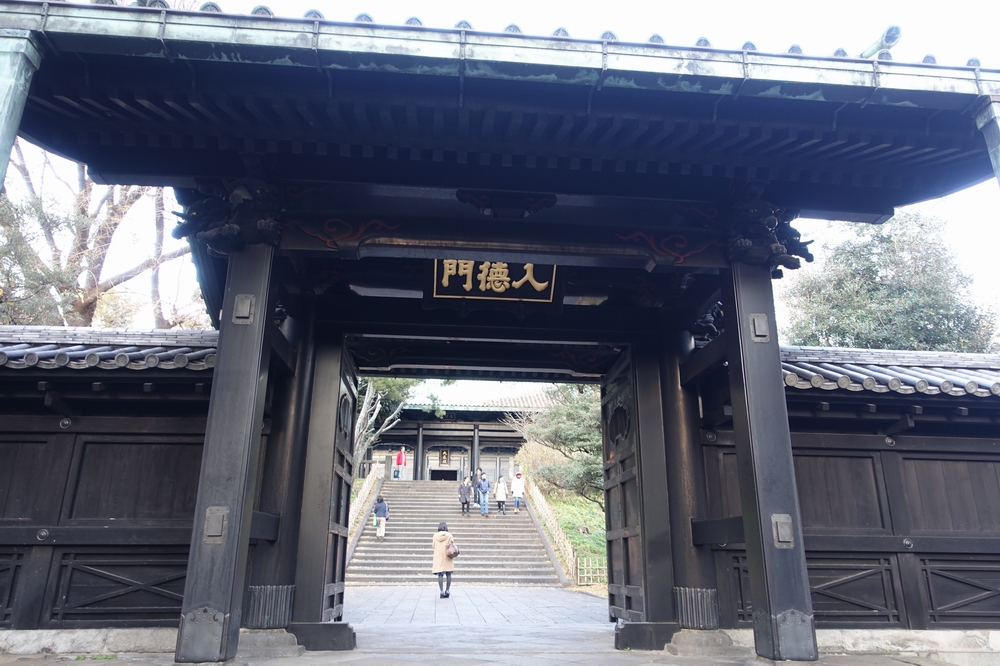 黒一色の中に金色の「入徳門」の額が目立っていました。小さな門ですが、震災や戦火をくぐり抜けてきたことを考えると感慨深いです。