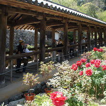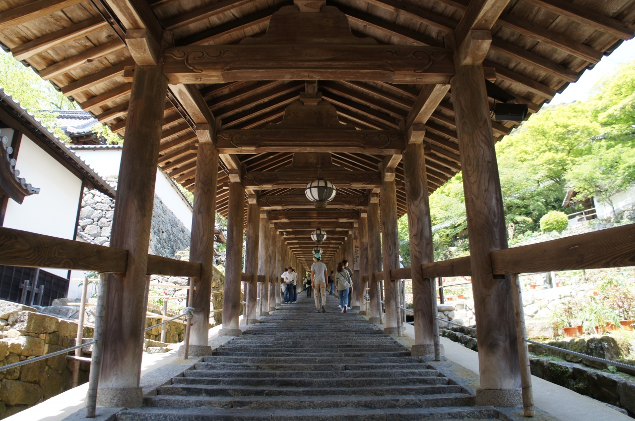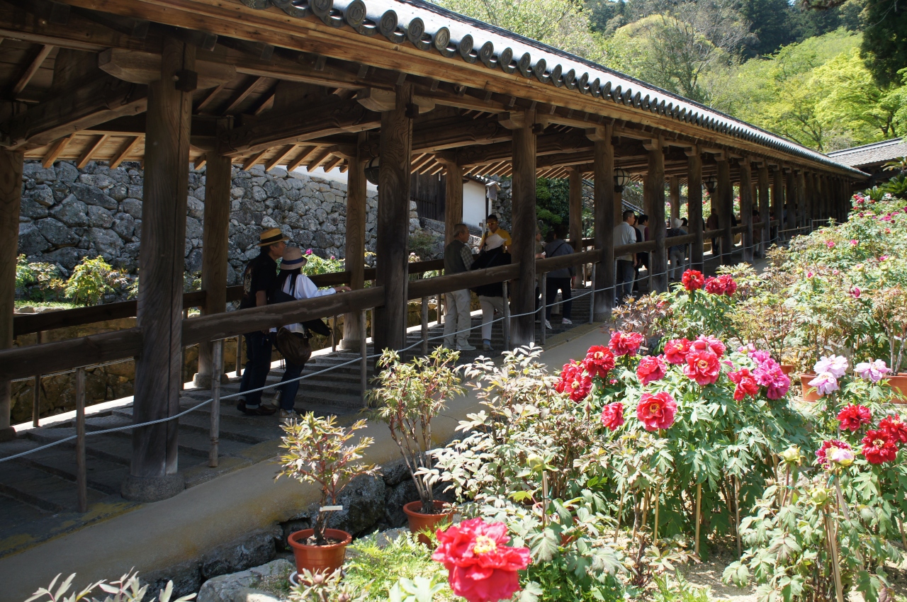 仁王門をくぐって本堂までは登廊の緩い石段を上っていきます。ずっと続いていく列柱と天井の吊り灯篭が風情を感じさせるとても趣ある登廊です。両脇には牡丹が植えられており、途中宗宝蔵の前は牡丹園になっていて、ちょうど見頃の美しい牡丹を堪能しました。登廊は上り専用になっています。