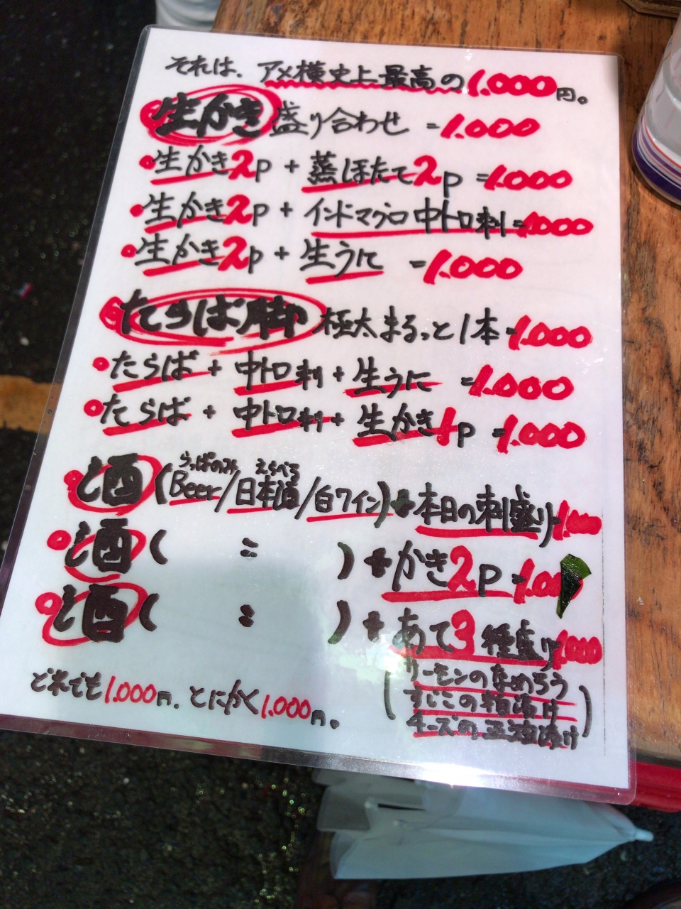 アメ横のちょうど御徒町と上野の中間ガード下にあるオープン屋台風海鮮立飲みの魚草
