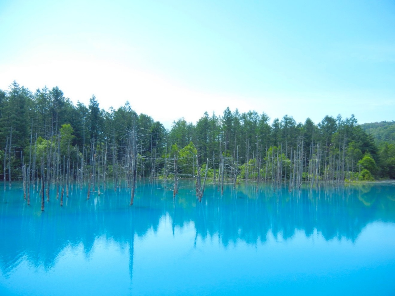 金曜日夕方4時半と土曜日の朝8時の二回行った。どちらの時間も待たずに駐車場に車を停めることができた。駐車場は未舗装なので土煙がやや立つかも。森の中を5分ほど歩くと木立の中から右手に青い池が見えて来る。夕方よりも朝の方が青い色が際立っていて良かった。透明ではないけどね。イタリア・ドロミテのカレッツァ湖のような風景。