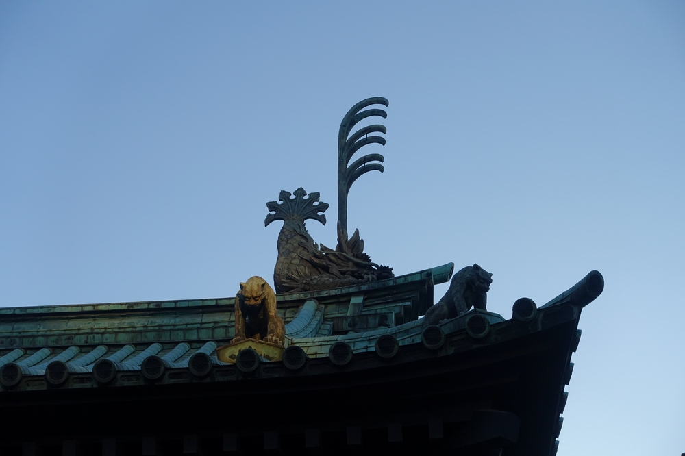 屋根の上にはシャチホコと猫のような変わった動物がいるので、ぜひ屋根にも注目してください。シャチホコみたいなのが鬼頭(きぎんとう)、猫みたいなのが鬼龍子(きりゅうし)という霊獣だそうです。
