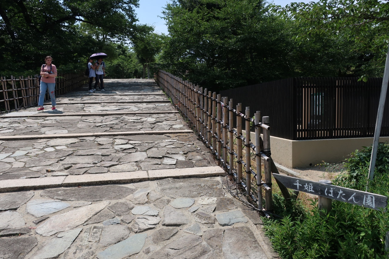 姫路城の三の丸広場の西側の高台に上ると千姫ぼたん園があります。整備された園内には沢山の牡丹が植えられていましたが、訪れたのが7月と牡丹の花が咲き終わり、葉牡丹でした。そのため千姫ぼたん園には私達以外は誰も居ませんでした。行くなら花咲く4,5月ですね。