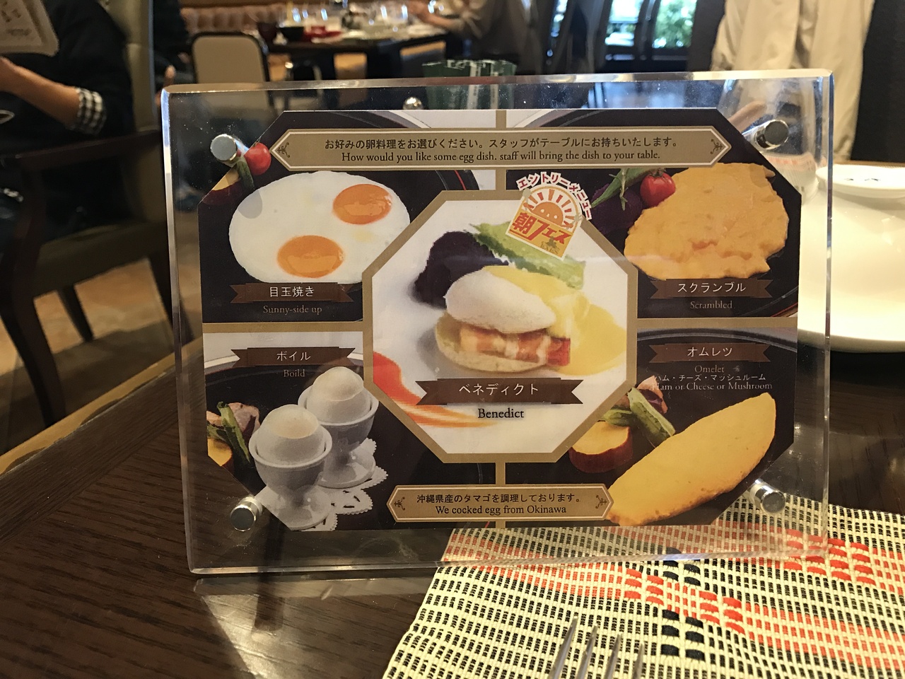 「沖縄スパリゾートエグゼス(Okinawa Spa Resort EXES)」宿泊時に、朝食で利用。レストランは、ホテルエントランスの1階にあるが、高台にあるホテルなので眺めが素晴らしい。朝食はブッフェスタイル。卵料理を、目玉焼き・スクランブル・ボイル・オムレツ・ベネディクトノナからテーブルオーダーできる。もちろん、「エッグベネディクト」を注文。満足度の高い朝食。