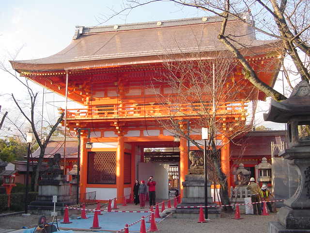 いくつかの入口がある八坂神社。有名なのは西楼門ですが、古い街並みに面した南楼門は規模も存在感も大きいです。改修工事中で、歩く場所も制限されていましたが、朱色の美しさは際立っています。門をくぐると正面に舞殿と本殿があるのも風格を感じます。