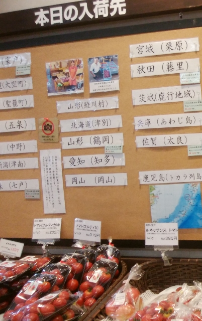 お店は通路のほうに生のお野菜をたくさん販売していました。また店頭に本日の入荷先が書いてあります。中に入ると、のれんで仕切られたイートインスペースがありました。狭いエリアですがテーブル席もありました。ジュースなども、以前山口の物産館でかった名産のゆずジュースが販売してあったり、紋別のホタテのステーキの冷蔵があったり、バラエティーに富んでいて、おいしそうなものがたくさんあります。