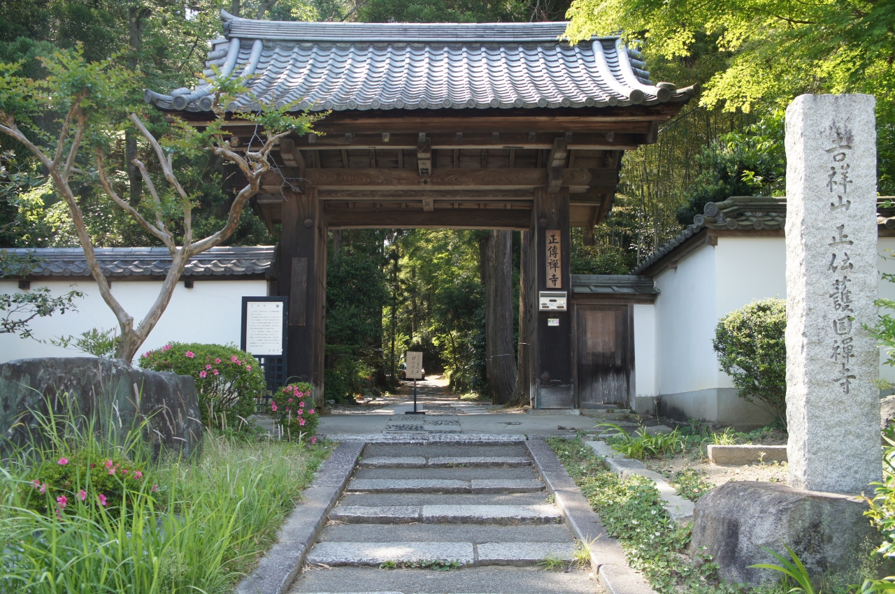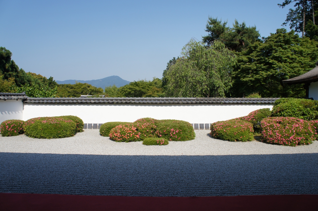 サツキの見頃に訪れました。何といっても人里離れたこの禅寺の魅力は、遠く比叡山を借景にして白砂に丸く刈り込まれたサツキだけが並ぶとてもシンプルな枯山水のお庭。訪れる人もほとんどなく(私の訪問中に来たのは個人タクシーのガイドさん同行のアメリカ人観光客が一組だけ)、静寂の中たった一人でお庭を眺めていると、余分なものがそぎ落とされて心洗われていくような気持になりました。