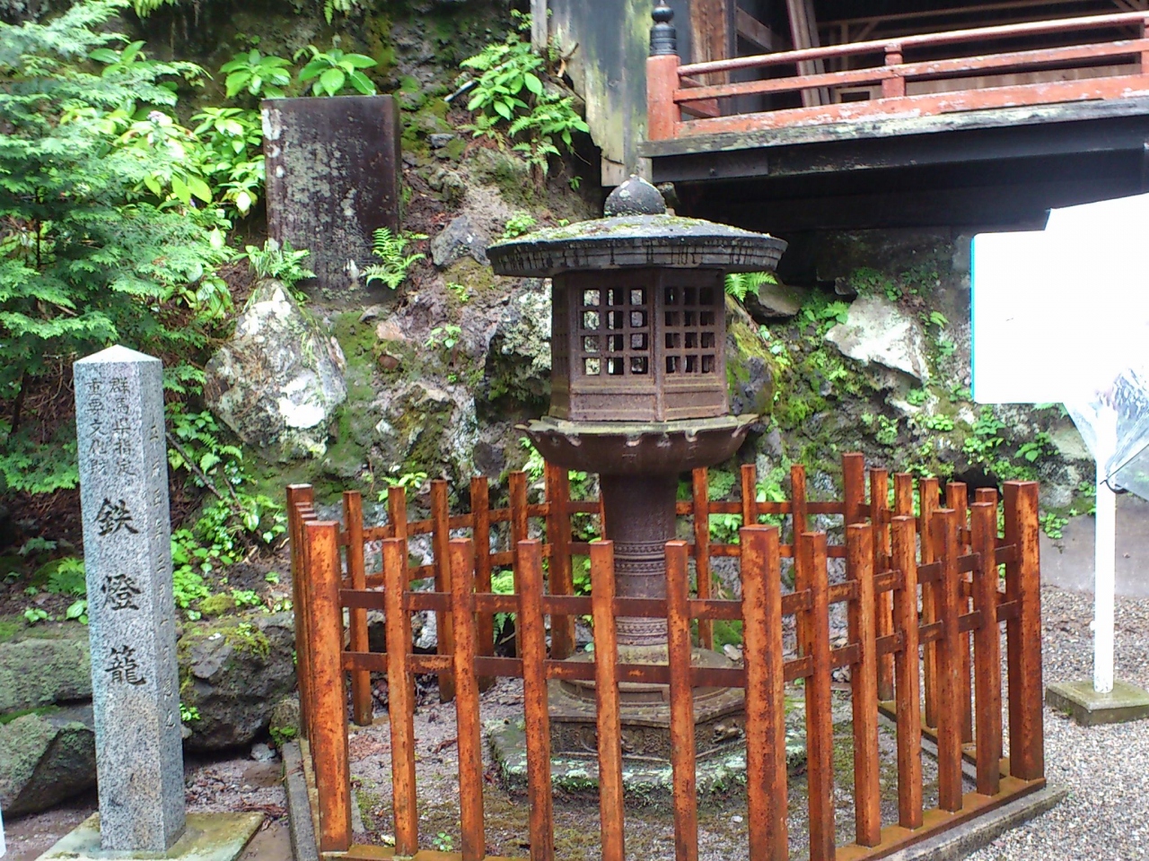 榛名神社の奥にある神楽殿と国祖社の間にこの鉄燈籠がありました。柵で囲われていて、直接触ったりすることはできません。灯篭は普通は石で作るはずですが、鉄製は珍しいと思います。建武の新政の新田義貞が寄進したものだそうです。
