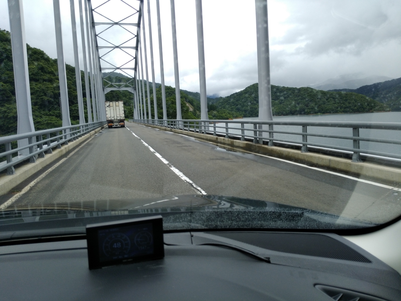 永平寺から九頭竜湖を抜けて郡上八幡に行く道中。巨大なロックフィルダムである九頭竜ダムでできた人造湖である九頭竜ダムです。ちょうど雨が激しくなり、またダンプなどの交通量も多くて、停めるに停められず。街道沿いもイマイチ駐車場もみあたらず残念です。ただ湖の広さ(長さ)はたっぷり感じられました。