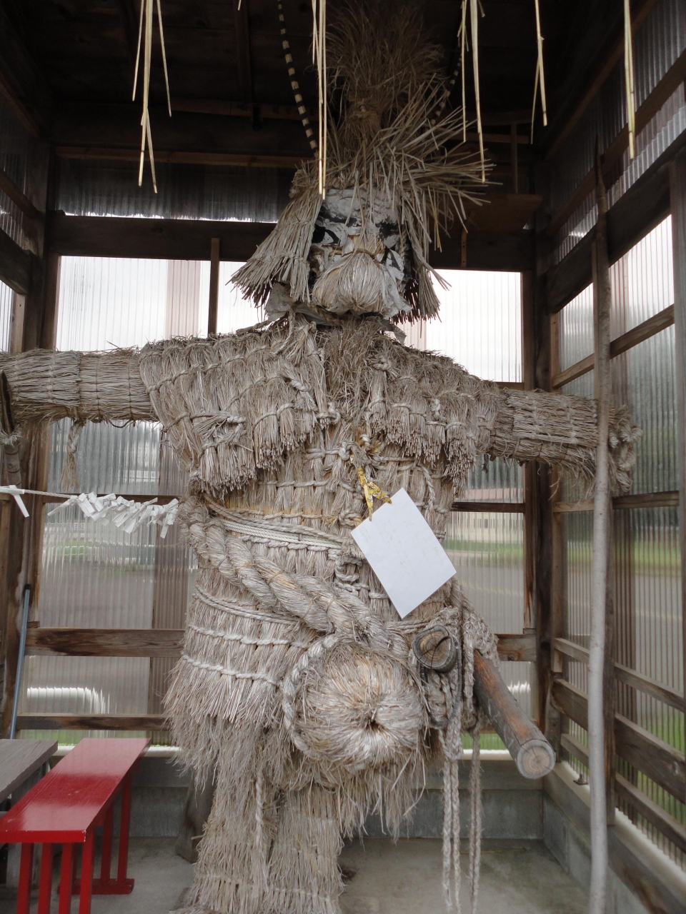 道の駅から車で10分ほど走ったところにあります。駐車場がものすごく広くて、地元の物産品を数多く取りそろえているのが、この道の駅の特長です。特売品もありますので、立ち寄られることをオススメします。この道の駅の傍らに、ワラで造られた等身大の神様が祀られています。頭には傘をかぶっていて、何と男性のシンボルもあらわに飛び出しています。ユーモラスなわら人形の神様に思わず微笑んでしまいました。