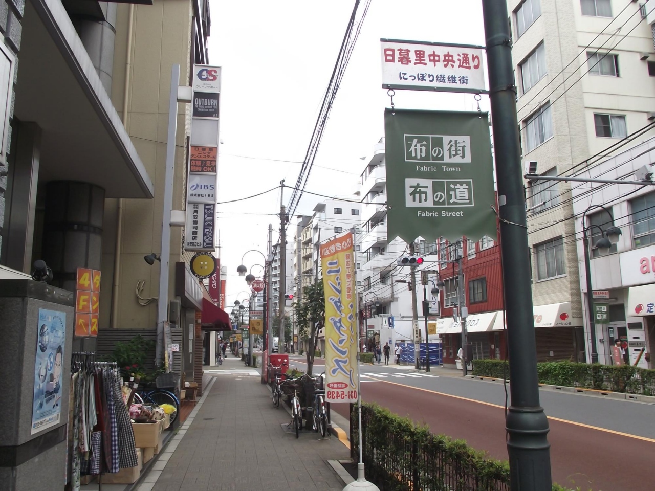 - JRなどの日暮里駅東口のバスロータリーから右斜め前のバス通り (日暮里中央通り) に入ったところから繊維街が始まります
