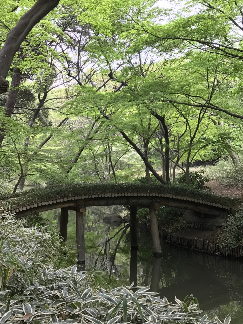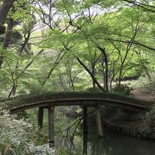 池から離れた裏の散策路は通る人も少なく本当に静か。その路を行くとモミジの木立の中にひっそりと橋が架かっています。この橋を渡って藤代峠を上ると景色の綺麗な展望台へ至ります。新緑のモミジと風情ある丸太橋はとても絵になる景色で、秋の紅葉の季節にはさぞ美しいだろうと思われました。