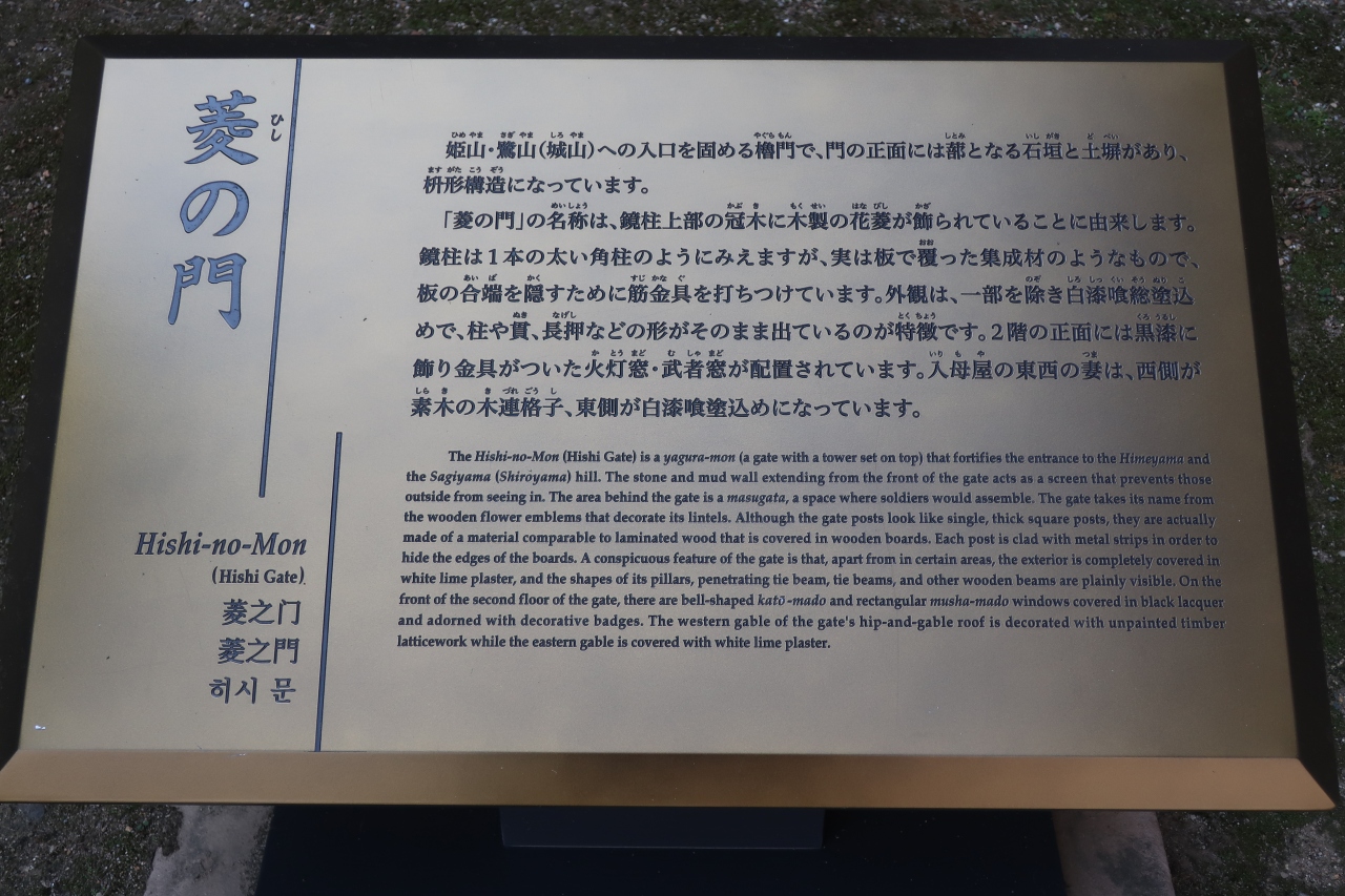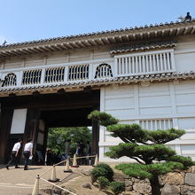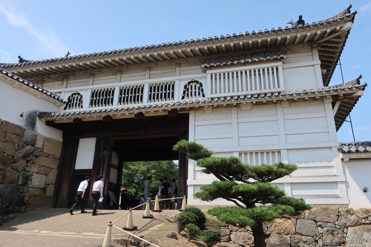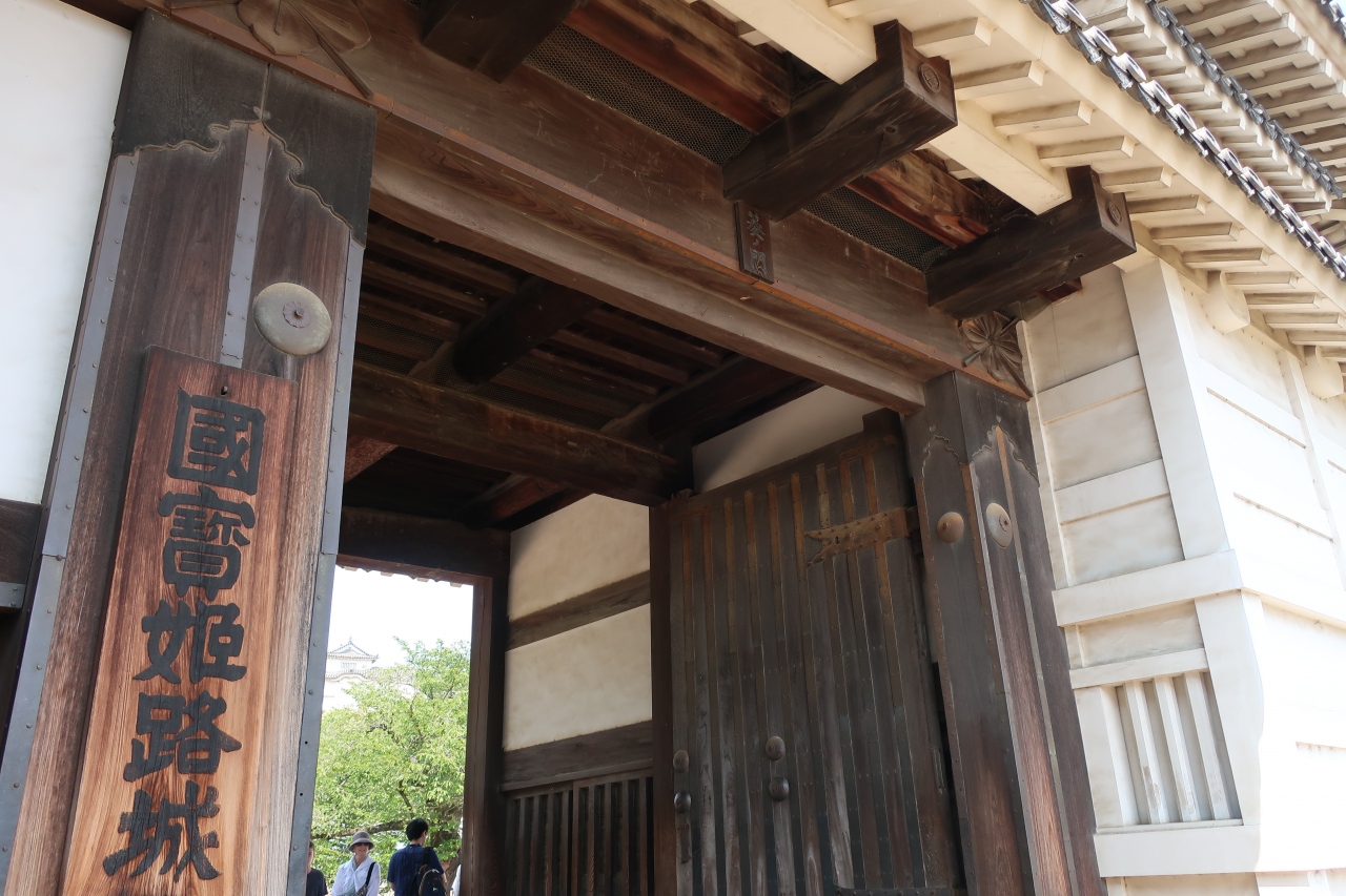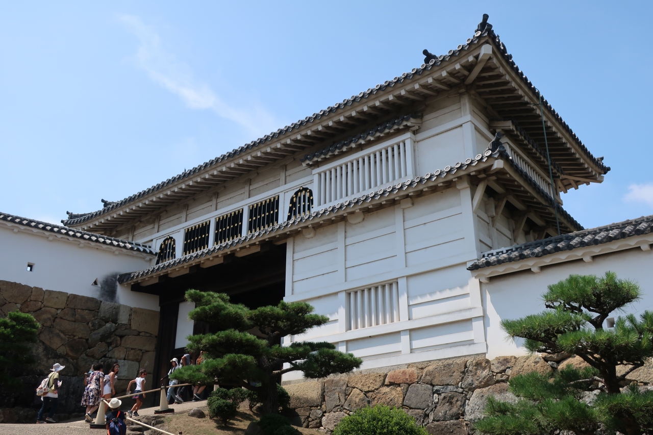 姫路城の登城口を入ってすぐに現れる大きな門です。白漆喰の櫓門で2階部分の窓には飾り金具のついた華頭窓と格子窓があり、荘厳さを感じます。城好き以外はあまり見ませんが、それだけではなく、防御機能として門の前には枡形、門上部には石落とし、内側には門番所が設けられており、鉄壁な造りになっています。