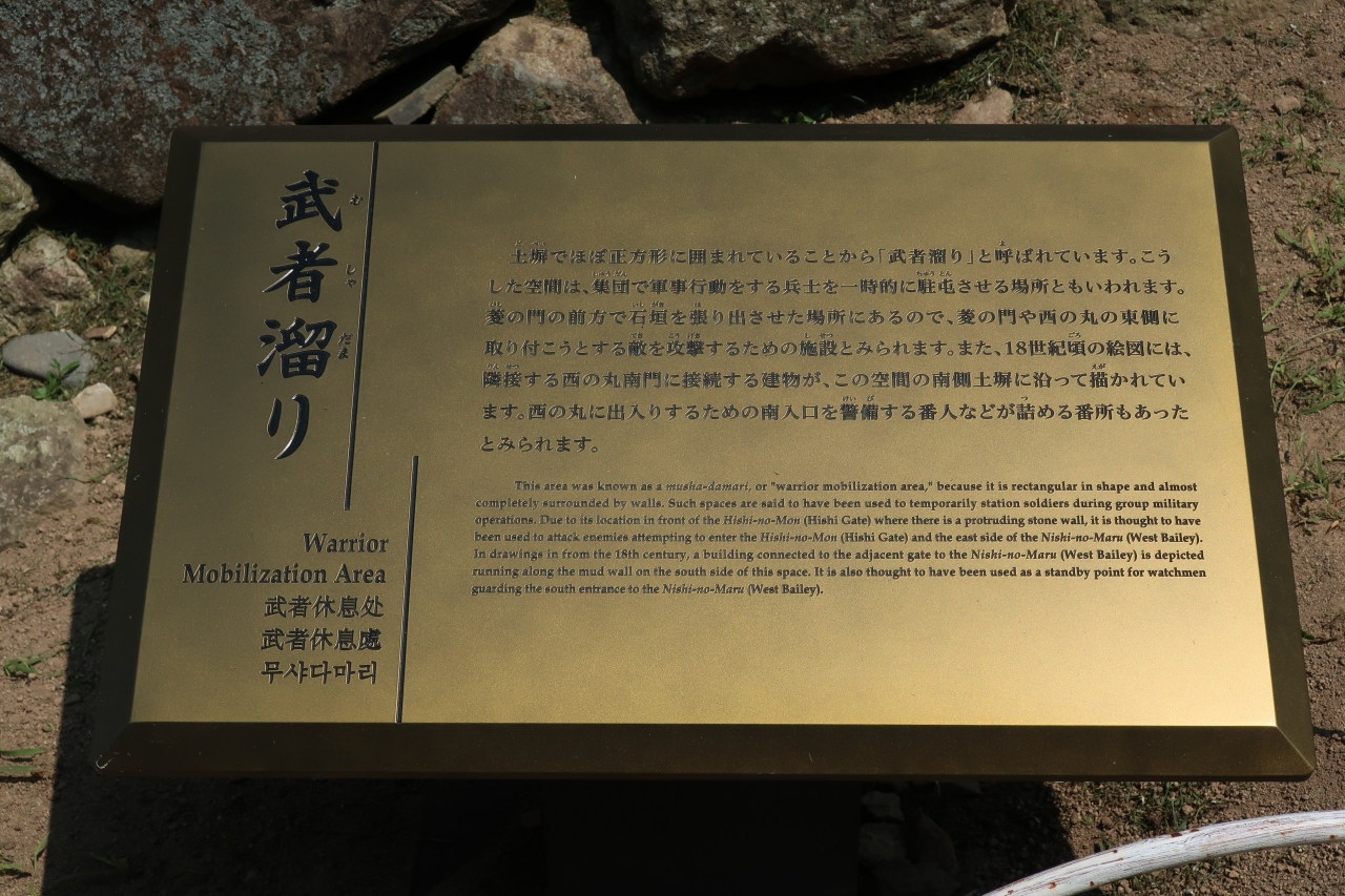 姫路城にはいくつかの武者溜まりと言える場所があります。武者溜りとは外部の敵から武者を隠して待機させた場所です。分かり易く、説明板のある武者溜りが菱の門から西の丸に向かうすぐ左手にある武者溜り。菱の門前の枡形を土塀の狭間越しに確認でき、攻撃し易い場所に作られているのが良く分かります。他にも分かり易いのが化粧櫓を出た所にある武者溜り。