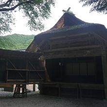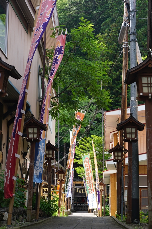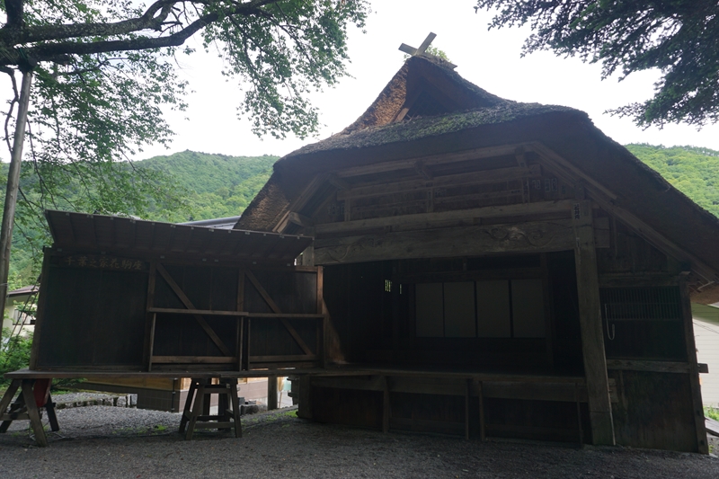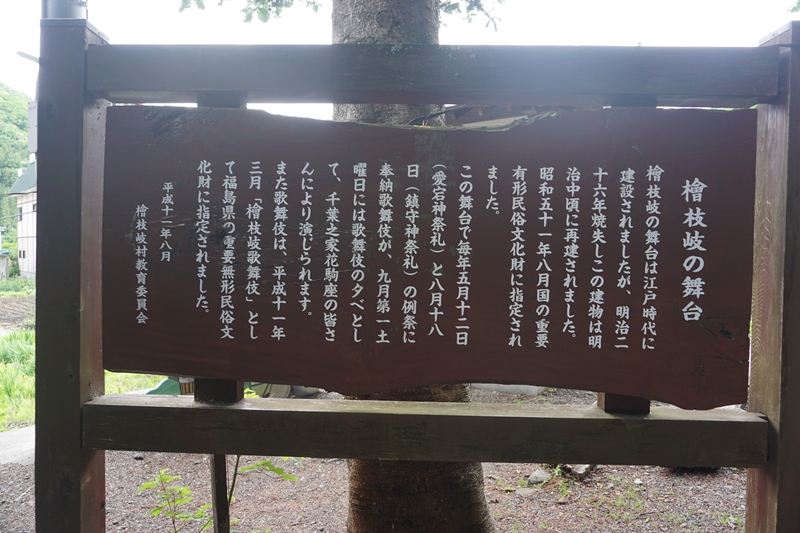 登り旗の立ち並ぶ参道を歩くとすぐ。参道の右側には檜枝岐歌舞伎を紹介する建物も建っており、無料で見学出来ました。