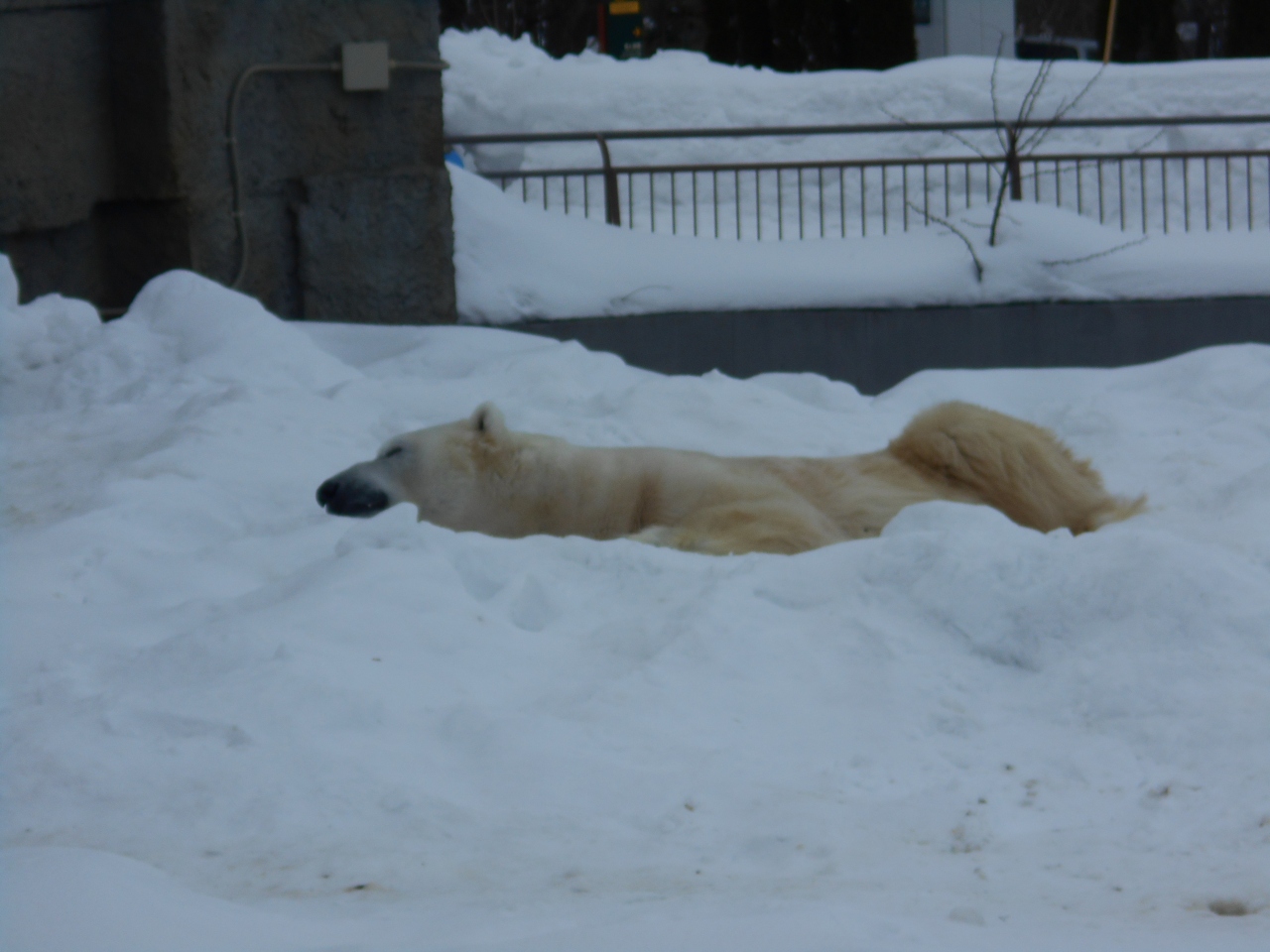 世界の熊館では人気者のシロクマがいます。かなりのマイペースで観客の存在は全く感じていないようです。遊び疲れた後なのかボールを抱えたまま眠っていました。極寒の中でもスヤスヤ眠れるのはさすがシロクマです。あまり間近で見られないのが残念です。