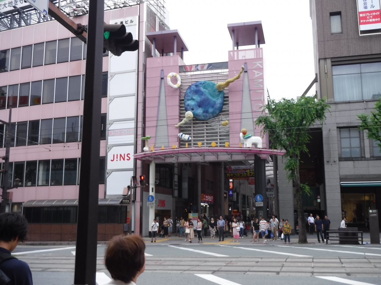 熊本市の中心にある商店街です。下通りと上通りがあり、大きい中心を通る道路で分かれています。どちらかというと下通り商店街のほうがいろいろなお店があり、にぎわっていました。きれいなアーケード商店街ですので、雨の日でも安心です。